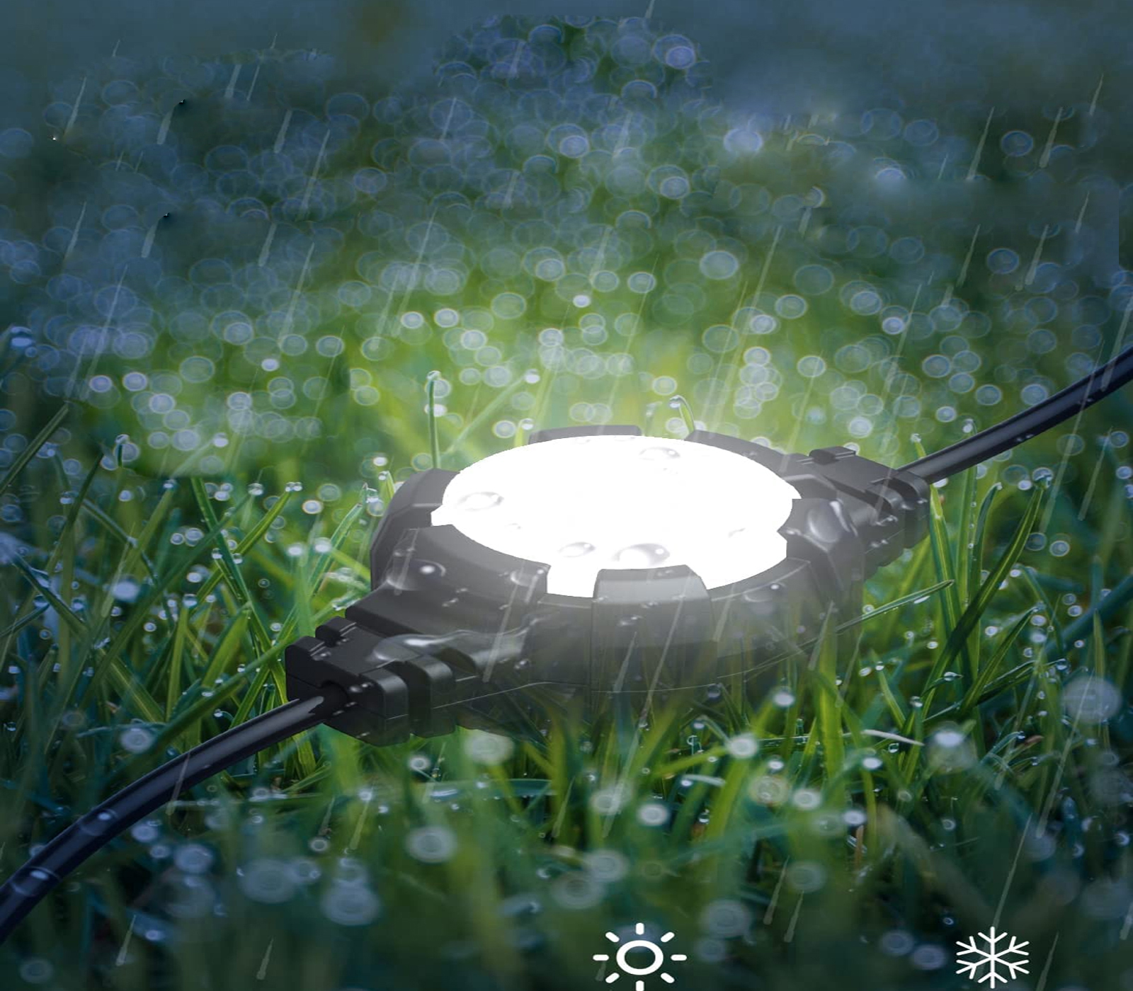 Particolare catena luminosa solare RGBW con tecnologia SMART dotata di 16 faretti con LED integrati multicolore ideale per ambienti esterni per illuminare e decorare giardini, abitazioni all'esterno di centri commerciali, parchi di divertimento, parchi gioco. La catena viene fornita completa di mini picchetti per il fissaggio a terreno di ogni LED e di supporti per il fissaggio a parete e muri.