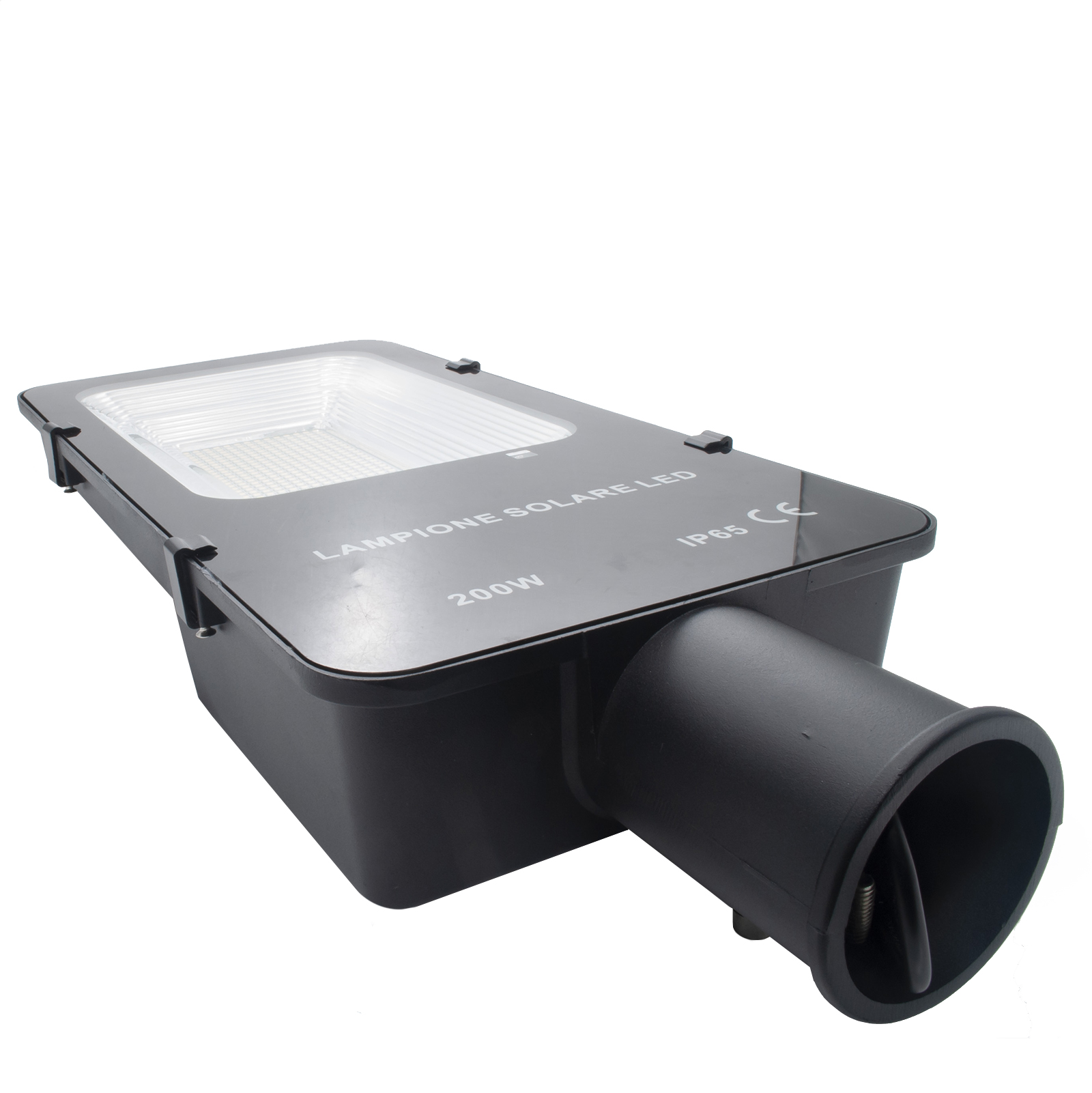 Faro stradale crepuscolare dotato di 406 LED SMD ad alta efficienza con potenza 200W completo di pannello solare che consente la ricarica della batteria interna, riducendo a zero i consumi energetici. Realizzato in alluminio resistente alle intemperie e gli agenti atmosferici ha un grado di protezione IP65. I LED ad luminosità consente d'illuminare viali, parchi pubblici, strade.