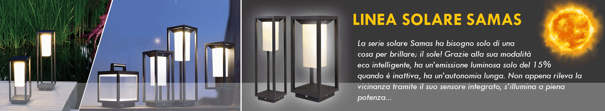 Questa lampada è dotata di pannello solare che ricarica la batteria interna abbattendo completamente i consumi energetici. L'intensità della luce varia secondo il modello da 137 lumen a 170 lumen con un angolo di luce di 98 gradi.