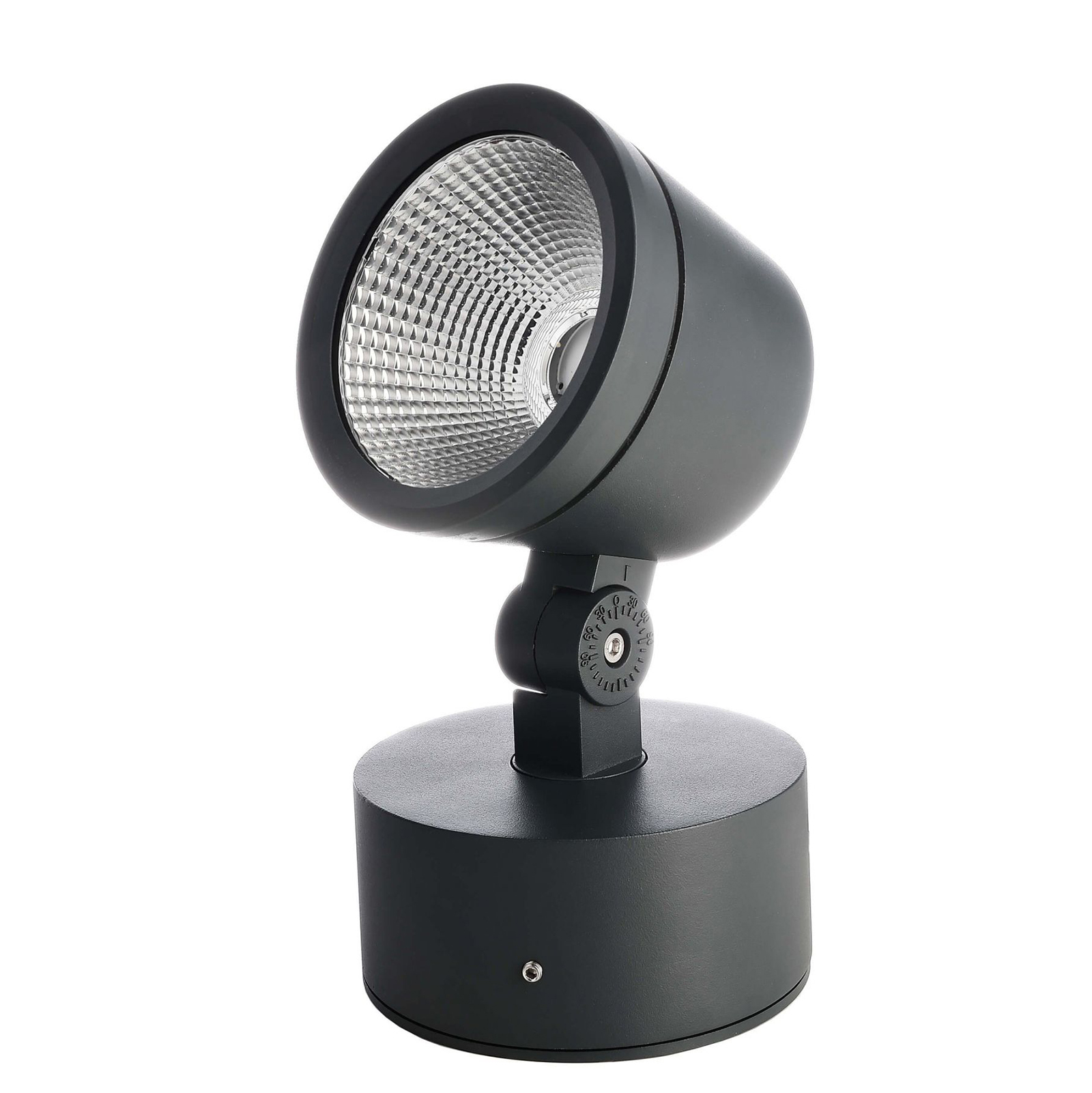 Realizzato in alluminio pressofuso verniciato a polveri epossidiche è resistente alle intemperie e gli agenti atmosferici, ha un grado di protezione IP65 ed è ideale per illuminare vetrine, negozi, nei giardini per dare luce a cespugli, aiuole, per creare effetti luminosi su pareti, facciate, oppure per illuminare oggetti dall'alto con installazione a soffitto, per illuminare insegne, tabelle, cartelli. Il LED COB di ultima generazione consente un grosso risparmio energetico. Inoltre il faretto è dimmerabile tramite dimmer esterno (non incluso).