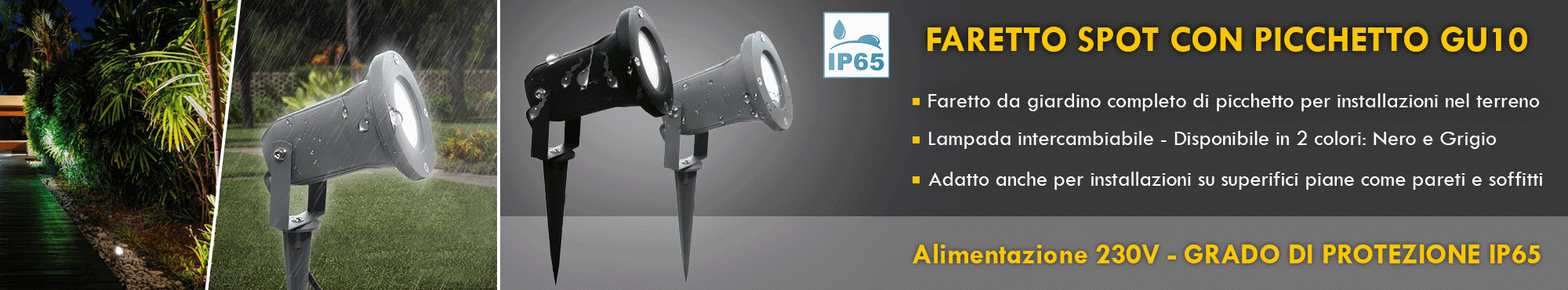 Realizzato in alluminio anti corrosivo ha un grado di protezione IP65 prettamente per uso esterno, resistente agli agenti atmosferici e alle intemperie. Integra al suo interno l'attacco GU10 ed è compatibile con la maggior parte di faretti e lampade GU10. La lampada è intercambiabile questo consente una facile sostituzione in caso di rottura a differenza di prodotti con LED integrati.