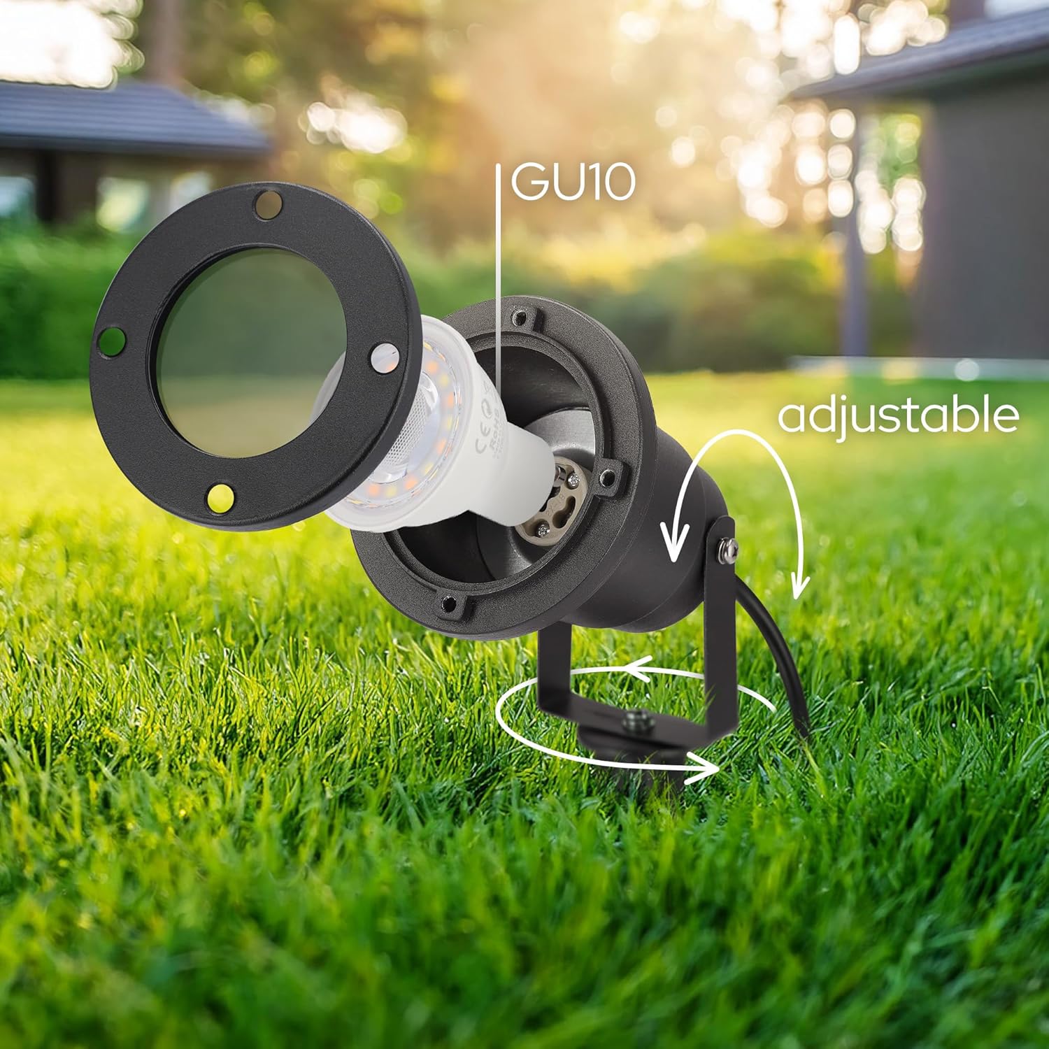 Realizzato in alluminio anti corrosivo ha un grado di protezione IP65 prettamente per uso esterno, resistente agli agenti atmosferici e alle intemperie. Integra al suo interno l'attacco GU10 ed è compatibile con la maggior parte di faretti e lampade GU10. La lampada è intercambiabile questo consente una facile sostituzione in caso di rottura a differenza di prodotti con LED integrati.