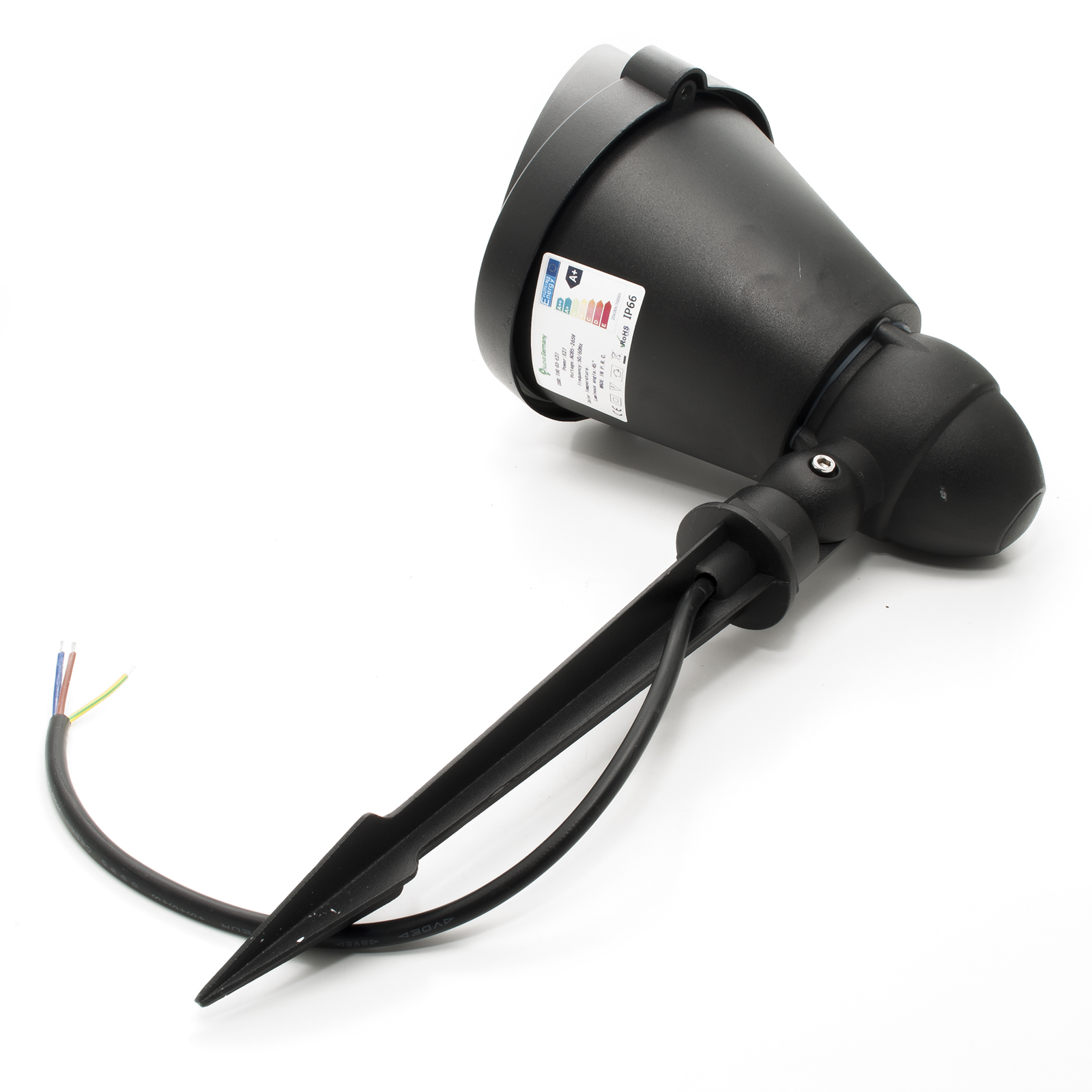 Si alimenta direttamente alla rete elettrica tramite il cavo a 230V - Dimensioni: lunghezza totale corpo proiettore: 24cm - Lunghezza picchetto: 21cm - Diametro campana: 15cm.
