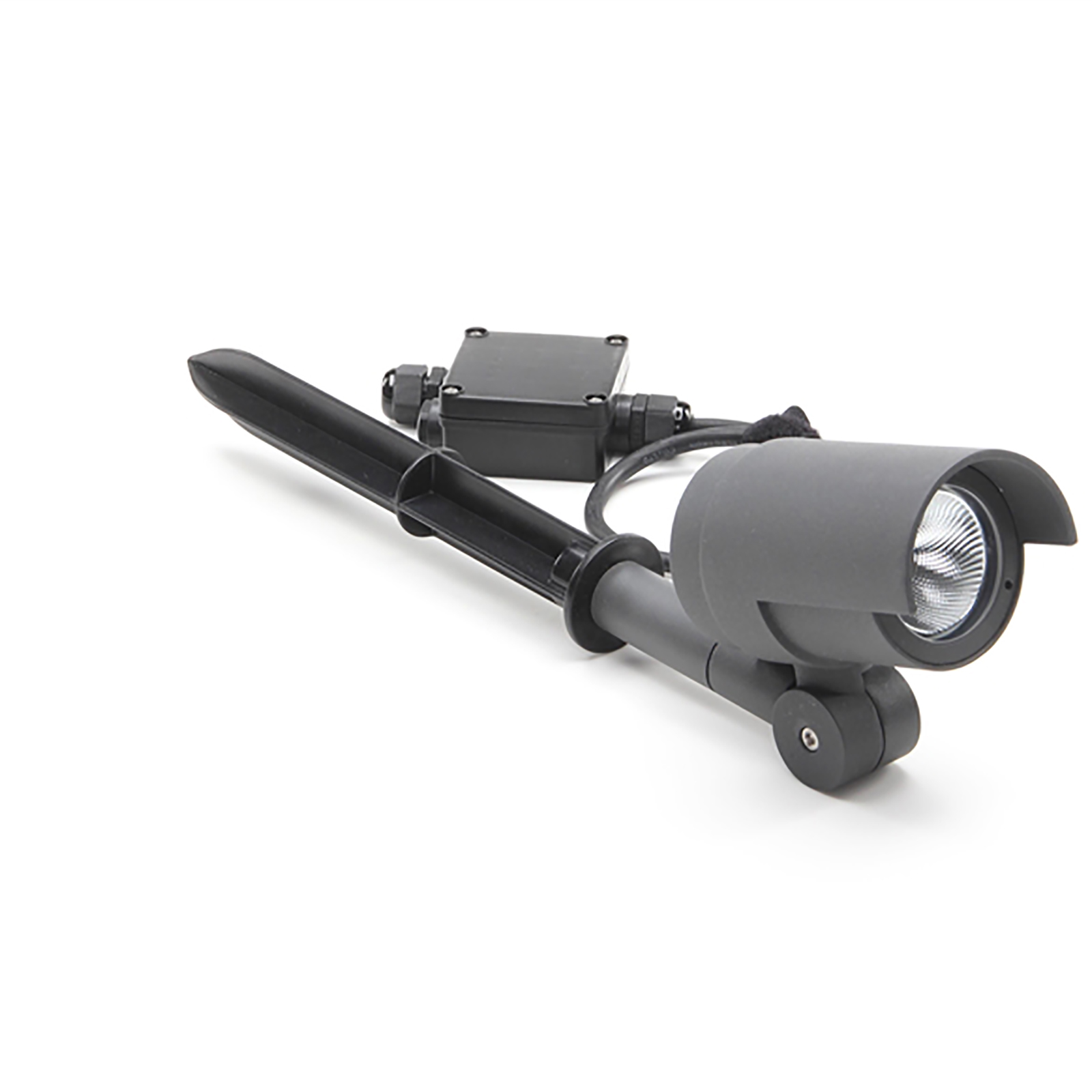 Il faretto è realizzato in alluminio pressofuso di colore grigio scuro ha un grado di protezione IP65 resistente alle intemperie e gli agenti atmosferici. Dotato di picchetto per una comoda installazione nel terreno. Questo faretto è dotato di connettore a tenuta stagna adatto per l'esterno.