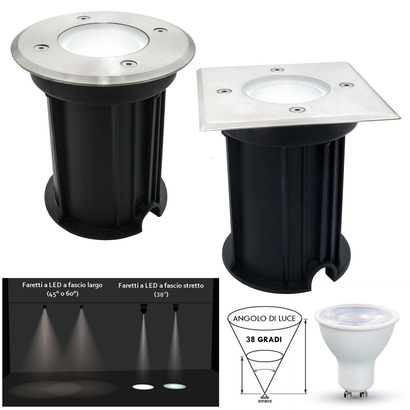 Il faretto ha la ghiera in acciaio inox ed un grado di protezione IP65 resistente alle intemperie e gli agenti atmosferici. Disponibile in 2 forme: rotondo o quadrato. Dotato di portalampada con attacco GU10 supporta faretti e lampadine con attacco GU10.