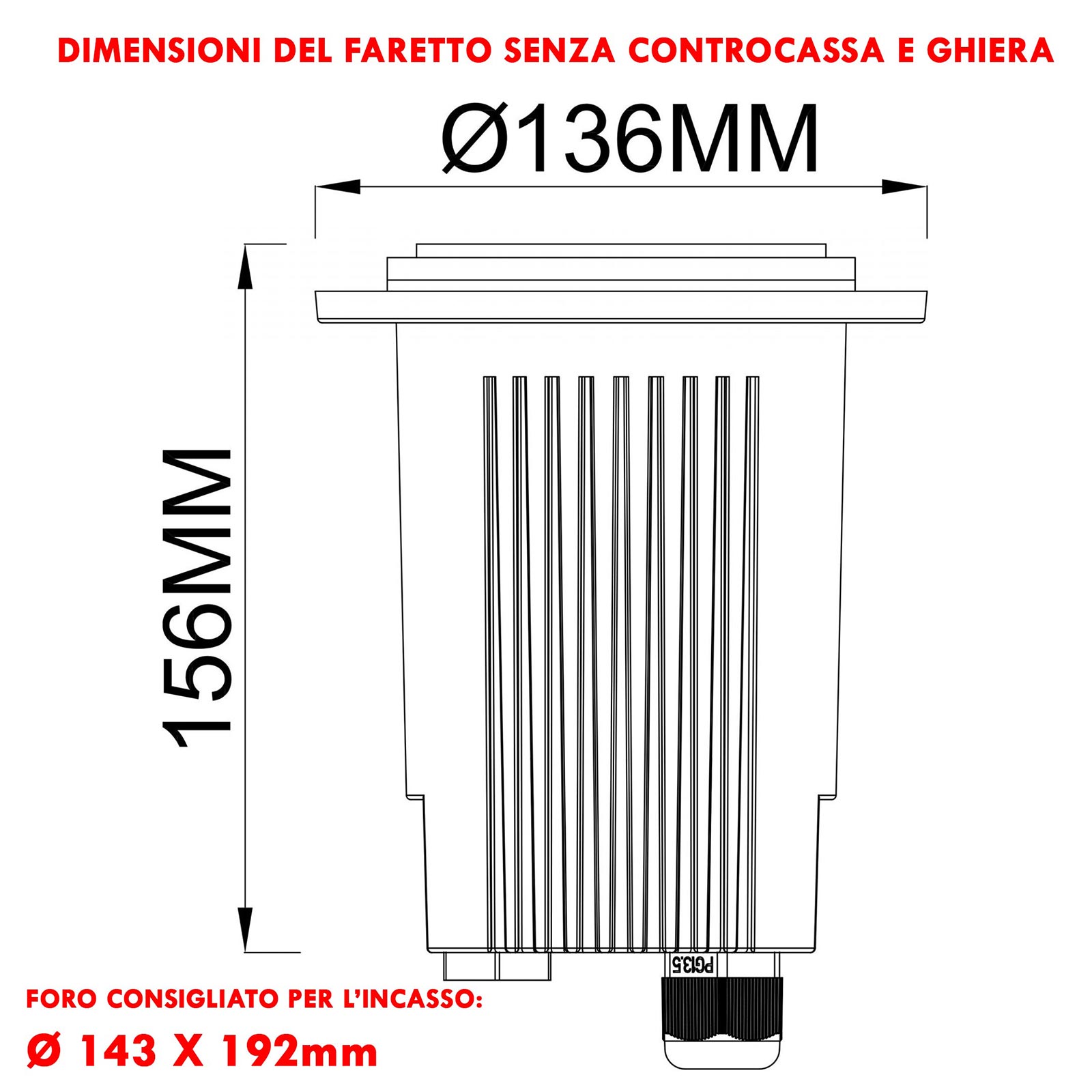 Dimensioni TOTALI del faretto senza controcassa e ghiera: Ø 136mm x 156mm - Dimensioni della ghiera: 150mm x 150mm x 3mm - Dimensioni della controcassa: Ø 143mm x 192mm.