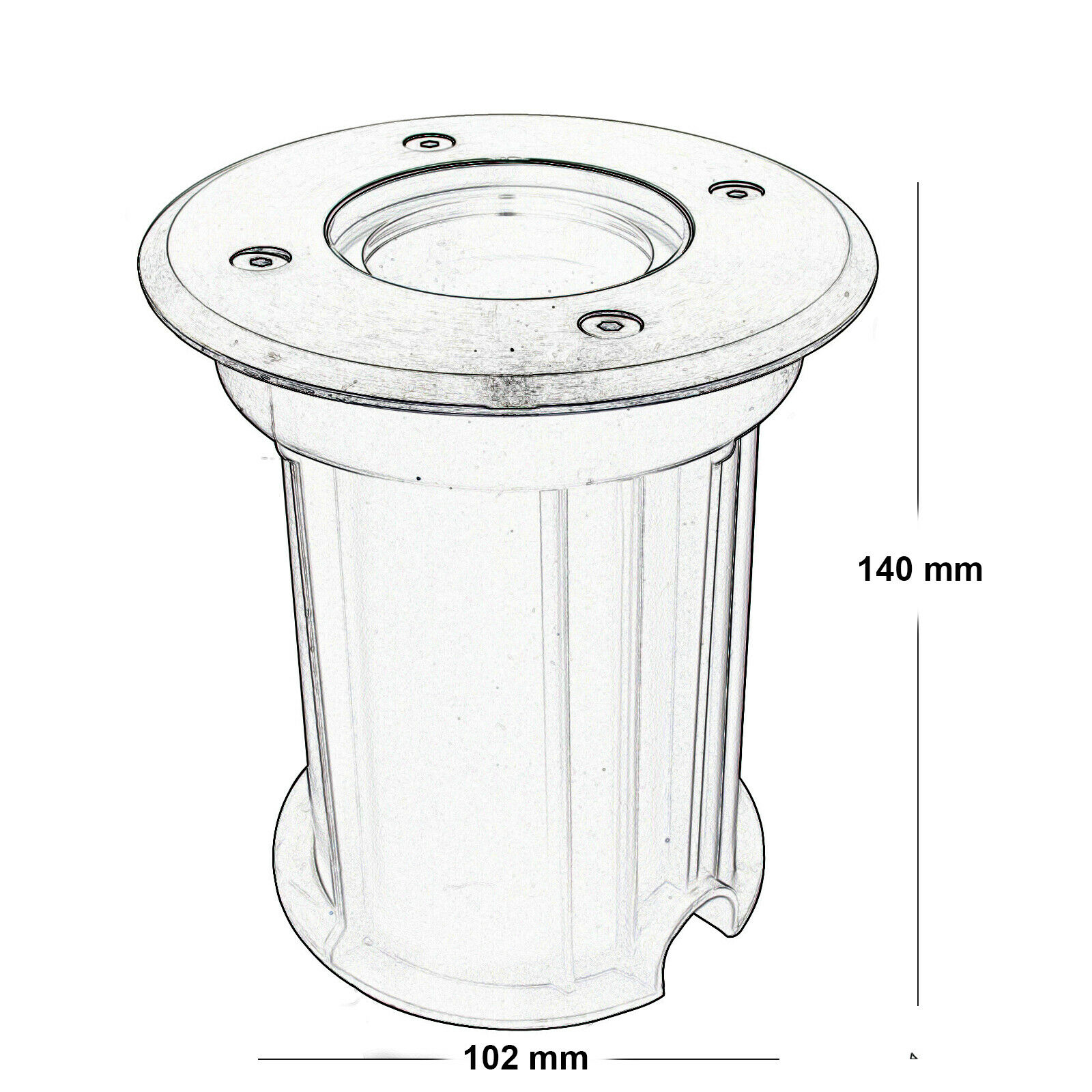 Questo faretto è un ottimo elemento per un illuminazione da esterno a terra da incasso. Dimensioni del faretto: Altezza totale 140 mm - Diametro esterno 120 mm - Sporgenza massima 5 mm - Dimensione del foro da incasso: 102 mm.