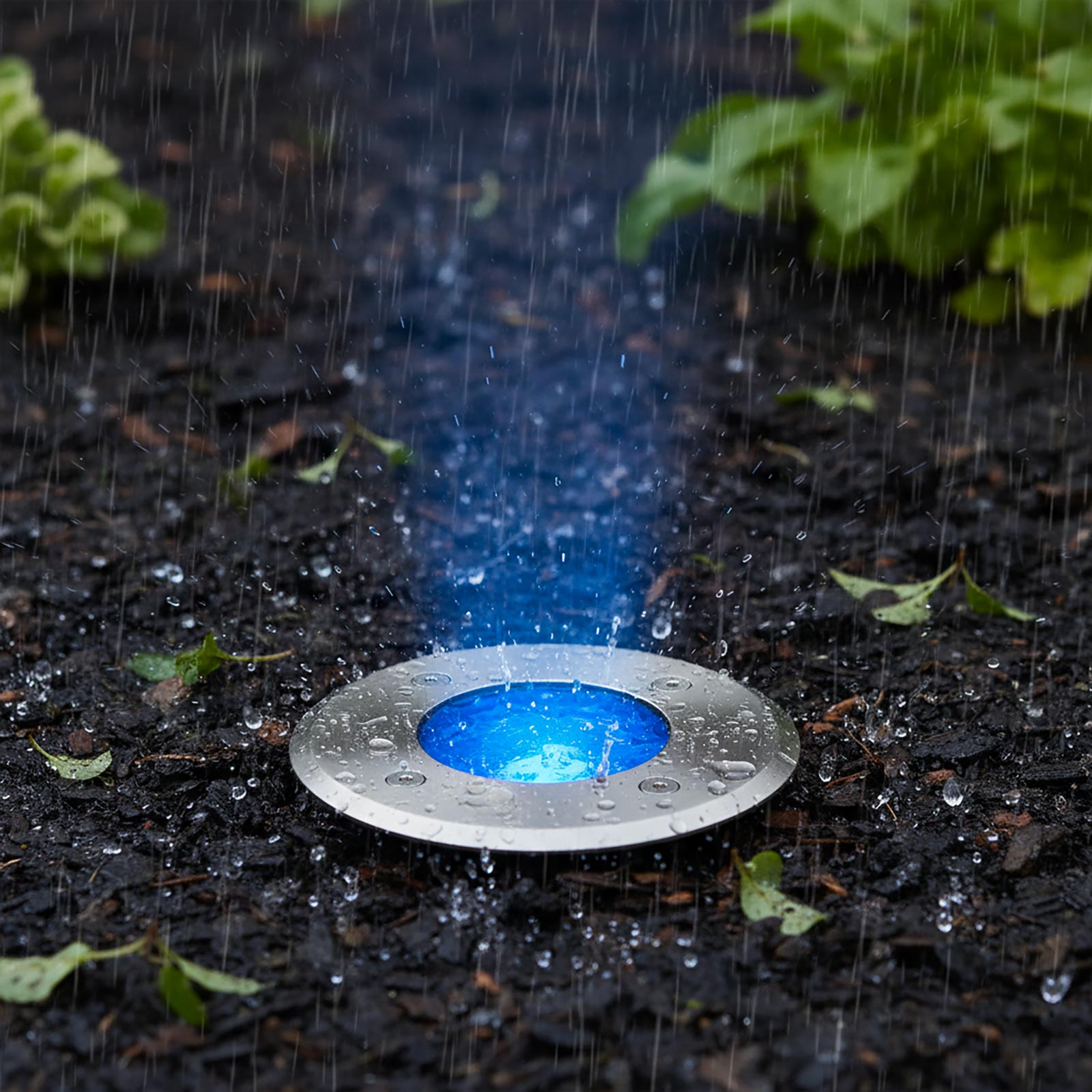Faretto calpestabile in acciaio inox con diffusore in vetro temperato e lampadina led GU10 6w disponibile con luce BLU, VERDE, ROSSO, inclusa.
