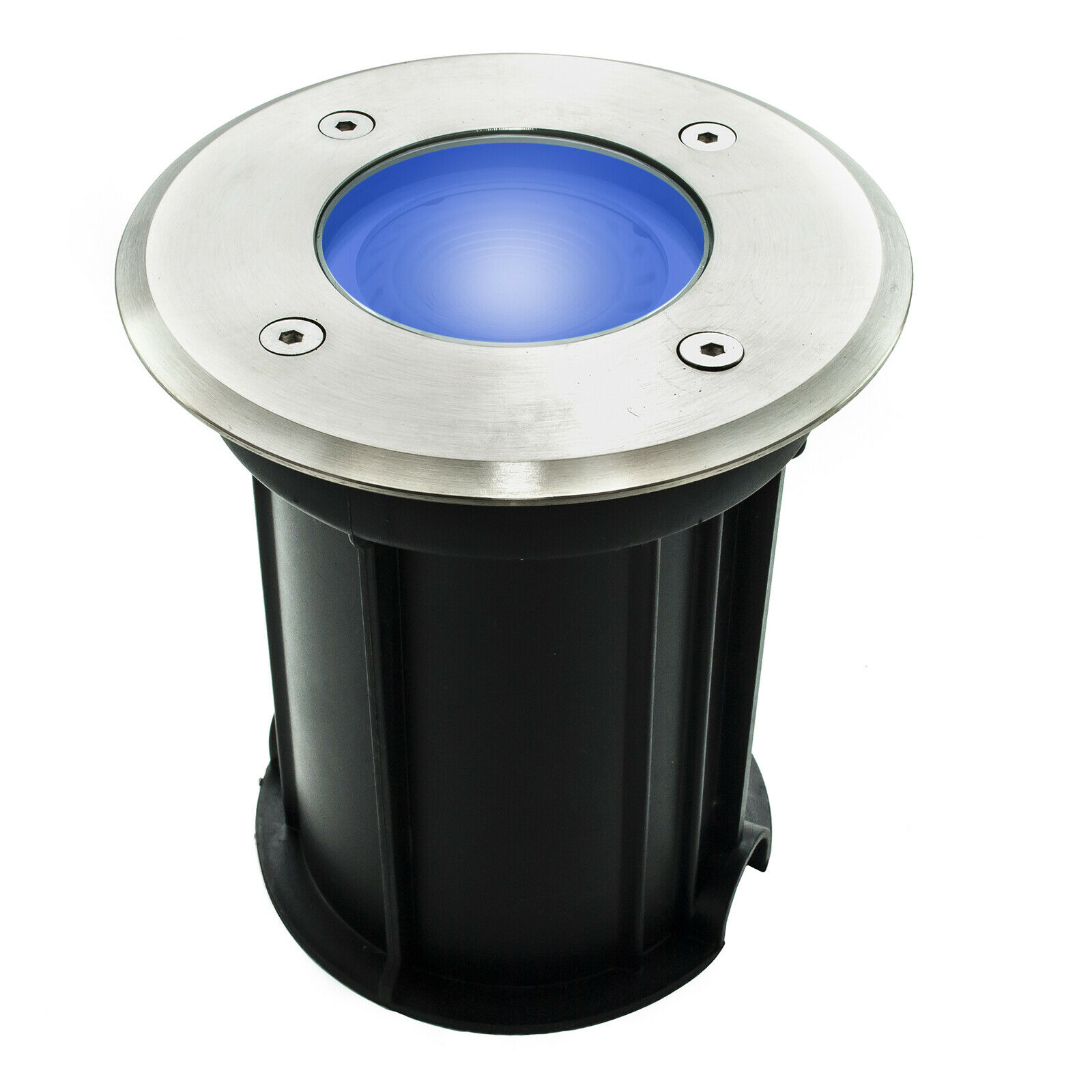 Faretto calpestabile in acciaio inox con diffusore in vetro temperato e lampadina led GU10 6w disponibile con luce BLU, VERDE, ROSSO, inclusa.
