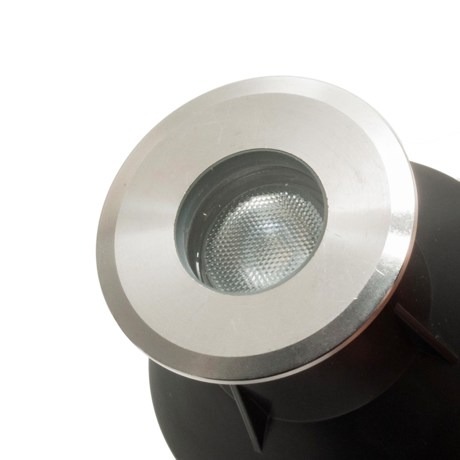 Faretto calpestabile tondo a tenuta stagna completo di controcassa in PVC dotato di LED integrati da 4W di potenza con grado di protezione IP68 adatto per uso esterno come segnapassi, segna via, come luci decorative per il giardino, bordo piscina, per segnalare un percorso pedonale, all'esterno di abitazioni, negozi, per delimitare percorsi, ma utile anche per l'illuminazione di piscine, laghetti, fontane.