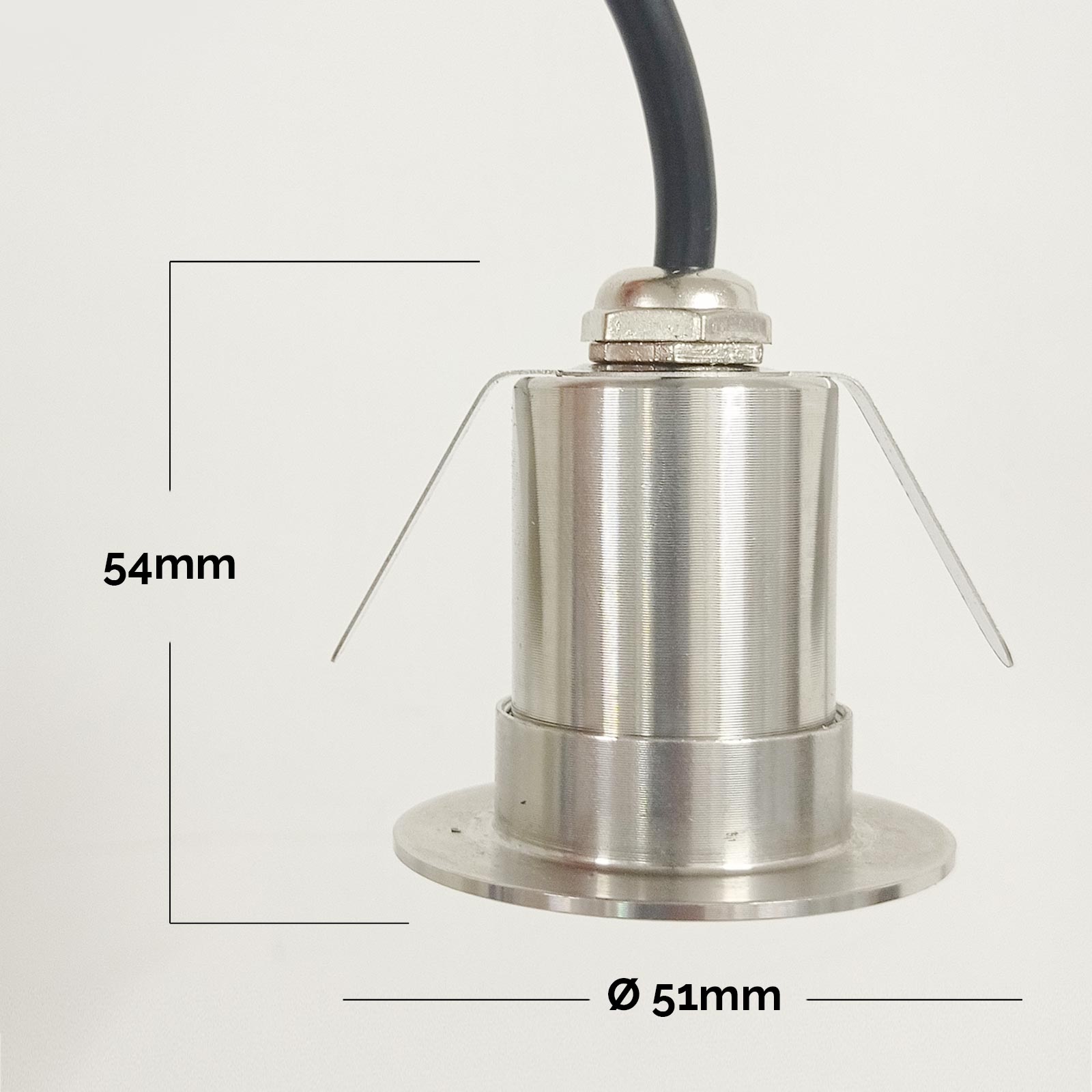 Il diametro del foro da incasso è Ø 40mm (parte alta) x Ø 78mm (base). Dimensioni del faretto: Ø 51mm x 54mm (senza controcassa) - Dimensioni controcassa: Ø 40mm x 87mm. La confezione comprende anche il cavo di connessione a vite per l'attacco dei fili alla centralina.