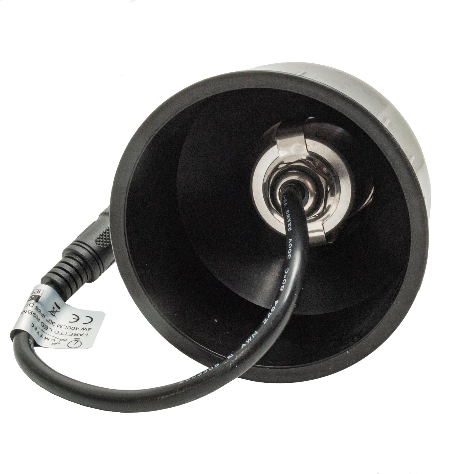 Il diametro del foro da incasso è Ø 40mm (parte alta) x Ø 78mm (base). Dimensioni del faretto: Ø 51mm x 54mm (senza controcassa) - Dimensioni controcassa: Ø 40mm x 87mm. La confezione comprende anche il cavo di connessione a vite per l'attacco dei fili alla centralina.
