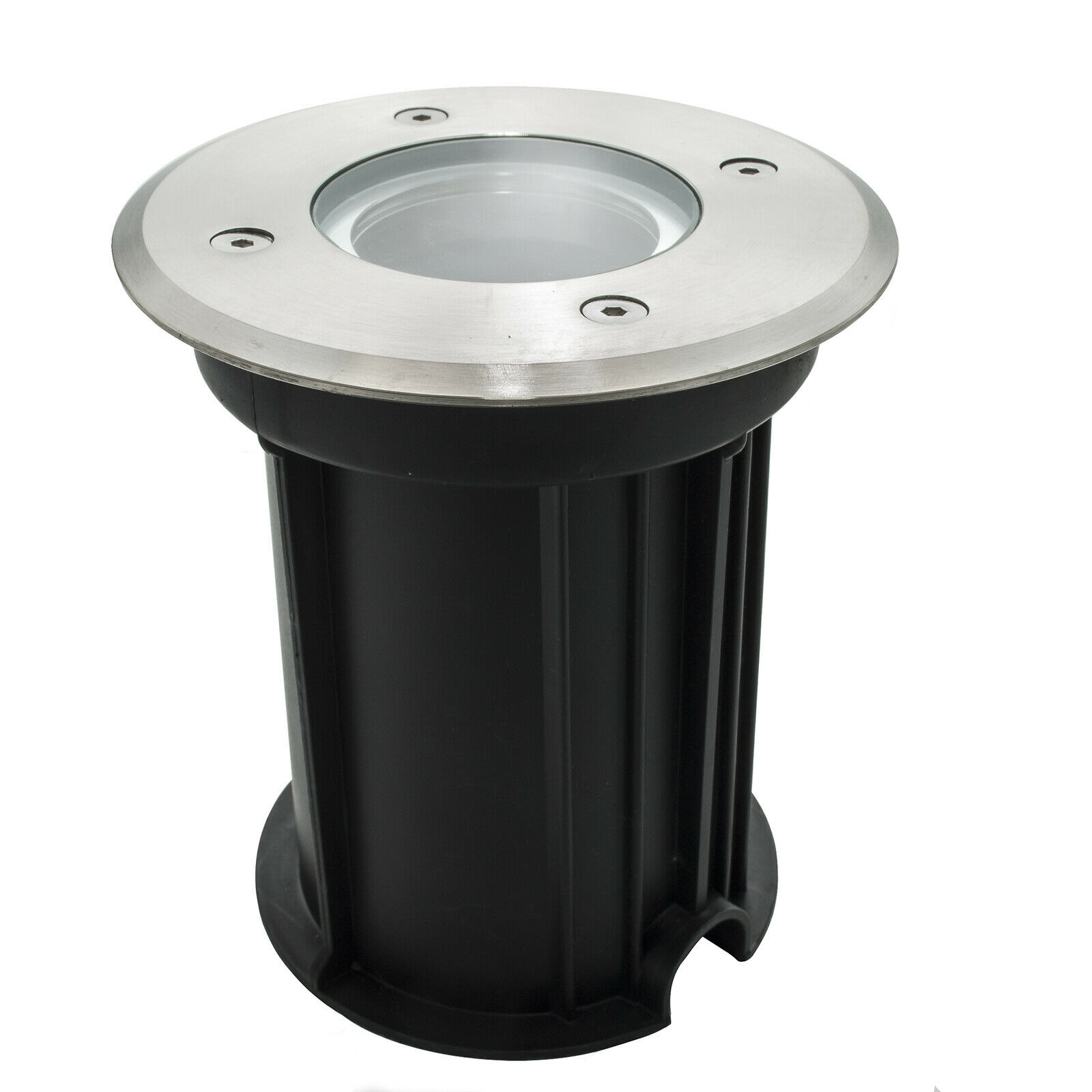 Faretto calpestabile in acciaio inox con diffusore in vetro temperato con lampadina LED intercambiabile adatto per uso esterno completo di controcassa in PVC da preinstallare nel getto di cemento o nel terreno, ideale per illuminare gli esterni come viali, giardini, stabilimenti balneari, parchi, viali privati, percorsi pedonali.