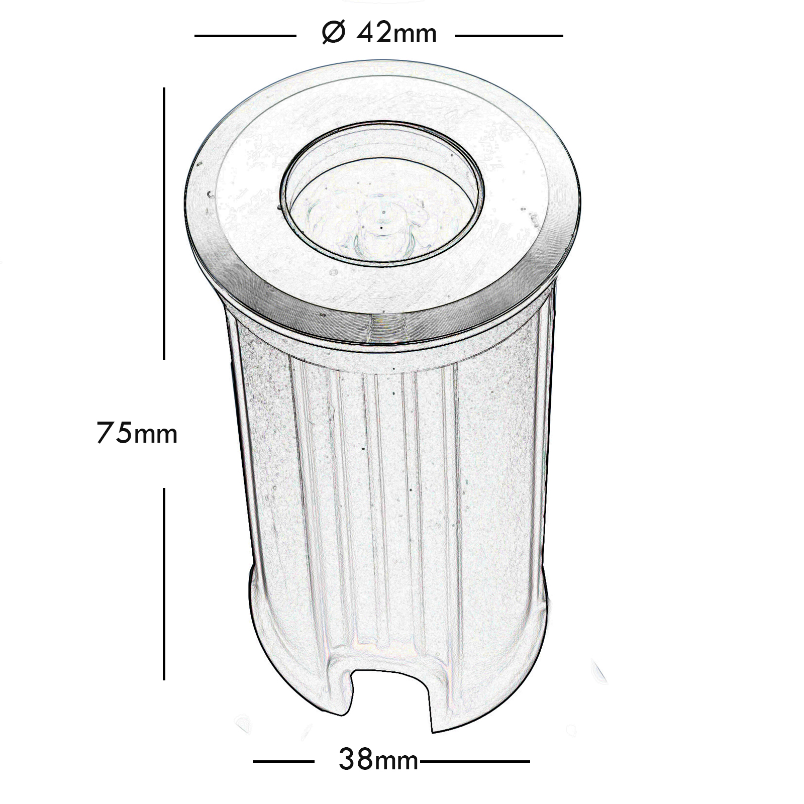 Il diametro del foro da incasso è Ø 38mm. Dimensioni: Ø 42mm x 75mm (altezza)
