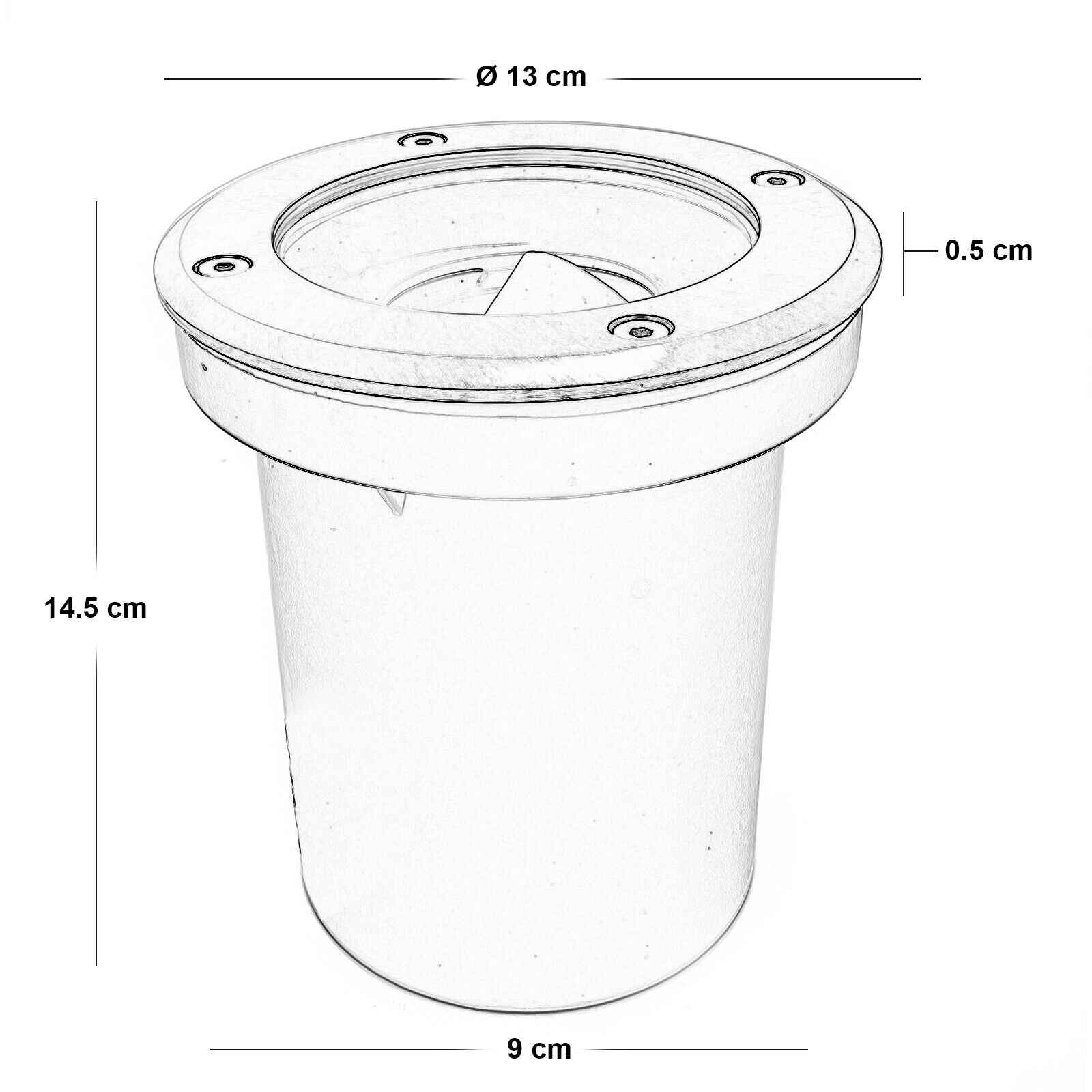 Dimensioni: Altezza totale 14.5 cm - Diametro esterno 13 cm - Sporgenza massima 0.5 cm - Diametro del foro consigliato per l'incasso: 12cm