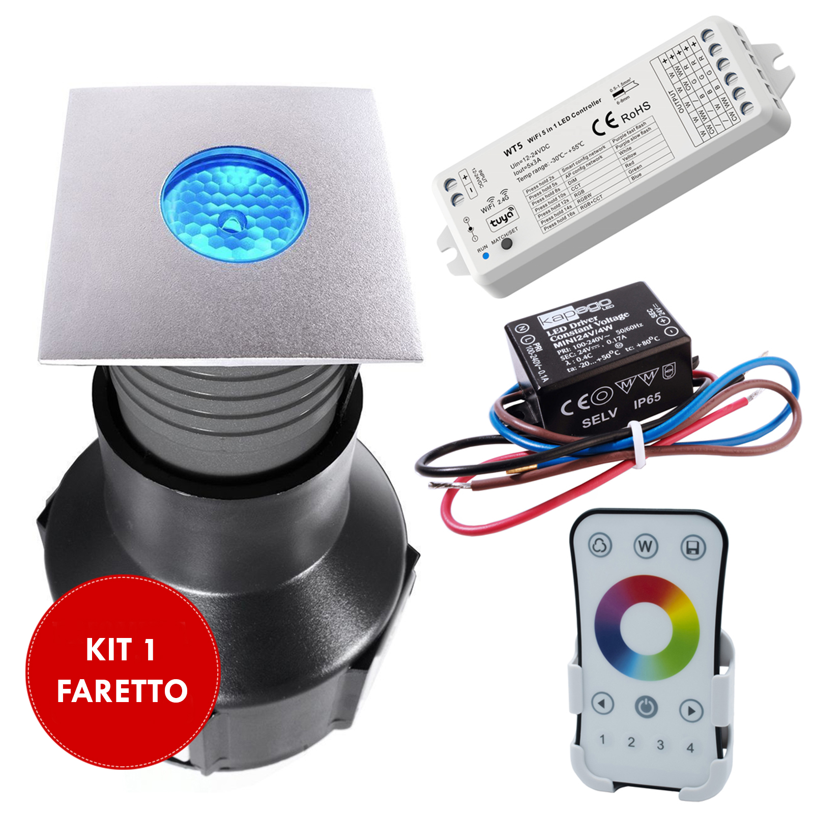 KIT Easy Square RGB II composto da 1 faretto LED calpestabile dimmerabile, una centralina SMART WiFi, un alimentatore a 24V ed un telecomando RF per gestire le funzioni. Adatto per uso esterno dotato di 1 LED RGB multicolore con potenza 3.50W ideale per creare effetti di luce colorata in spazi esterni come segnapassi per percorsi pedonali, come luci di sicurezza in parcheggi, garage, all'esterno di giardini, per viali, sentieri, a bordo piscina, adatto anche come luce per segnalare gradini, scale.