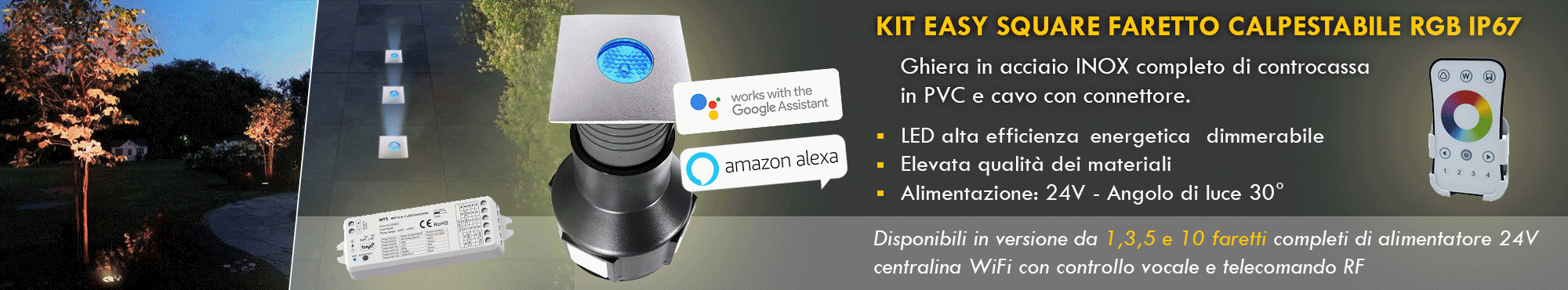 KIT Easy Square RGB II composto da 1 faretto LED calpestabile dimmerabile, una centralina SMART WiFi, un alimentatore a 24V ed un telecomando RF per gestire le funzioni. Adatto per uso esterno dotato di 1 LED RGB multicolore con potenza 3.50W ideale per creare effetti di luce colorata in spazi esterni come segnapassi per percorsi pedonali, come luci di sicurezza in parcheggi, garage, all'esterno di giardini, per viali, sentieri, a bordo piscina, adatto anche come luce per segnalare gradini, scale.
