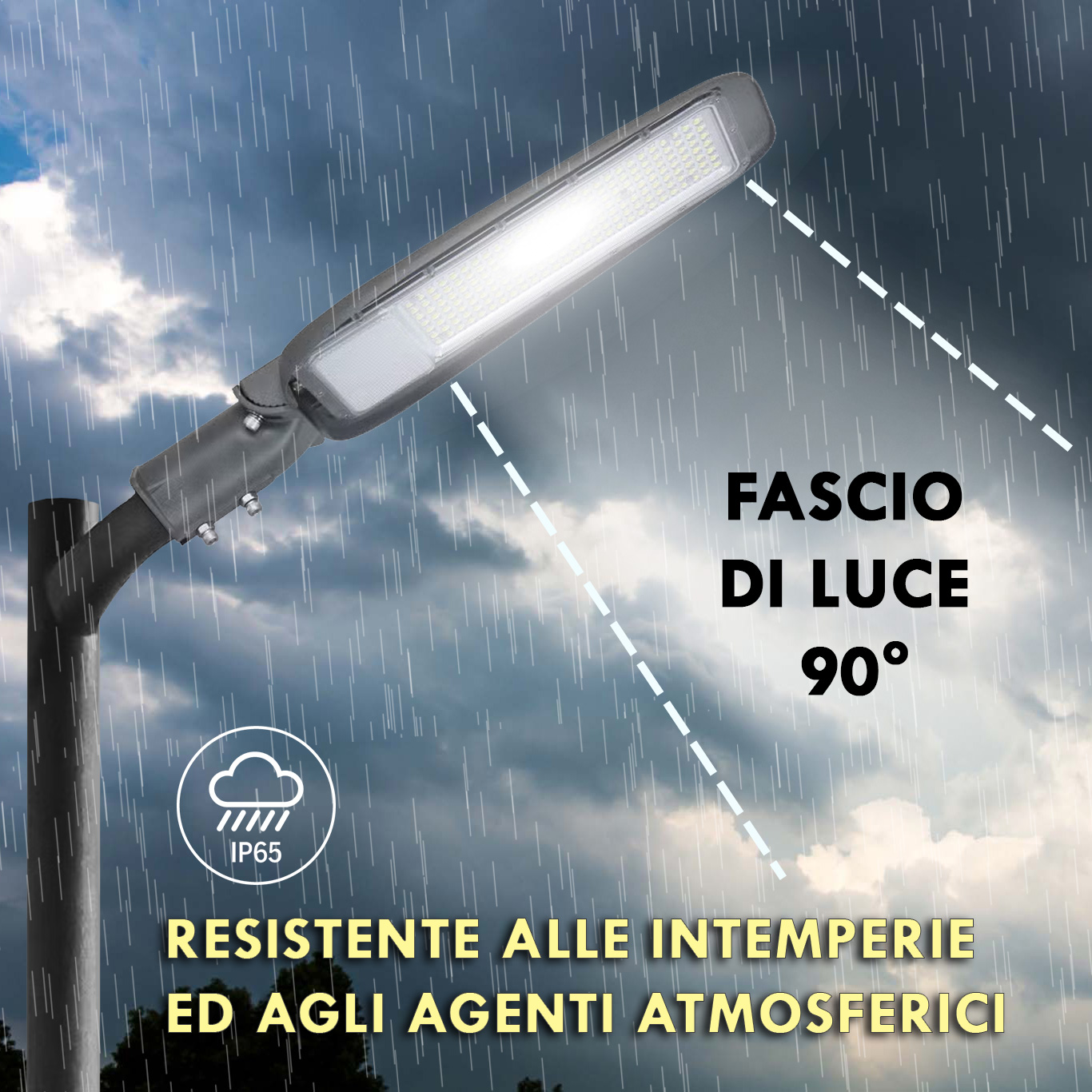 Disponibile con potenza: 50W - 100W e 150W - La struttura in alluminio verniciato a polveri epossidiche consente una maggiore durata nel tempo e inoltre permette un ottima dissipazione di calore garantendo resistenza agli agenti atmosferici. Il lampione ha un grado di impermeabilità: IP65 adatto per usi in spazi esterni.