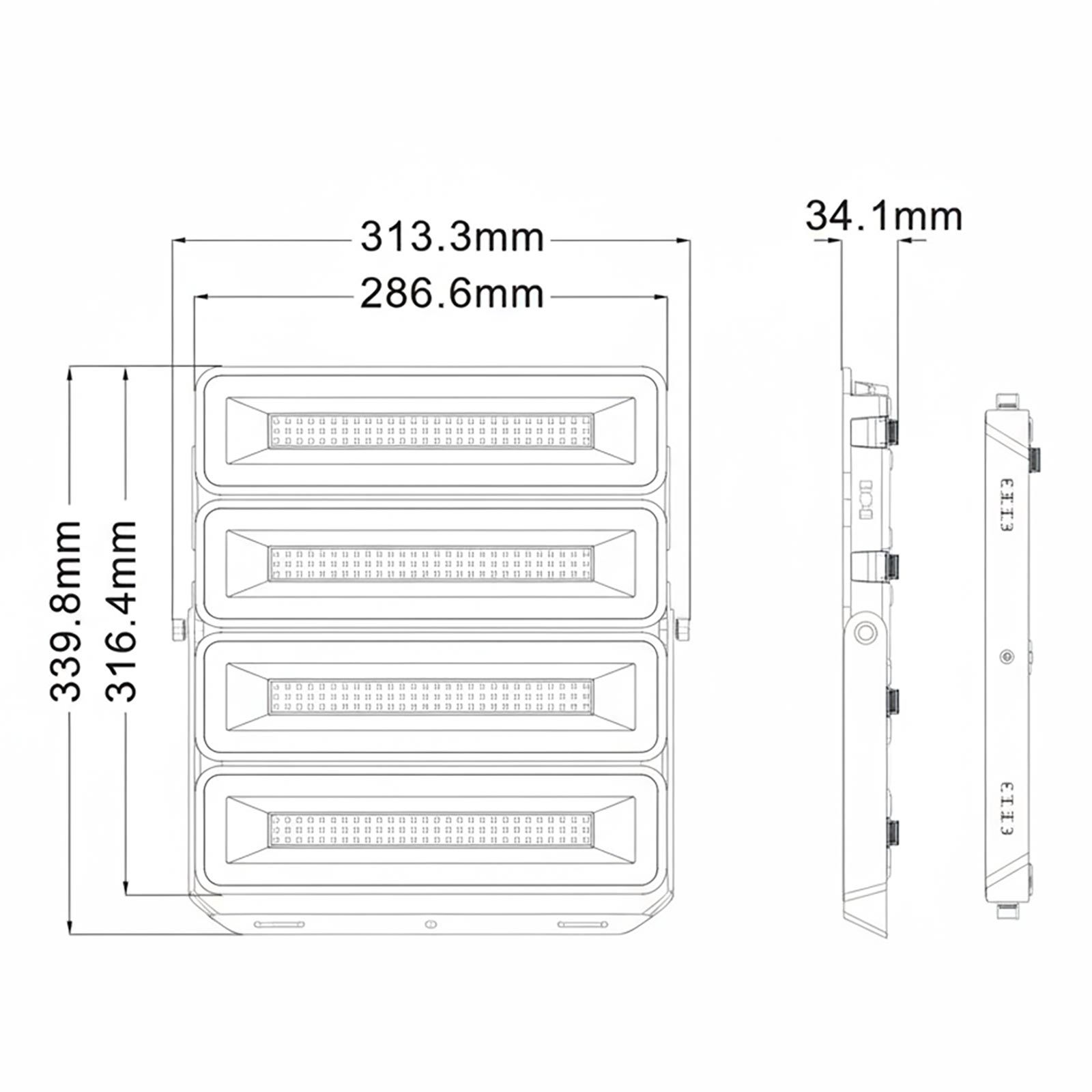 • Dimensione del faro completo di staffa: 313.3mm (larghezza) x 339.8mm (altezza) x 34.1mm (spessore)