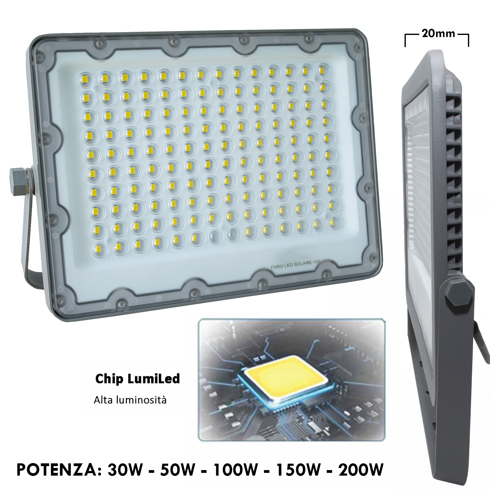 Il faro è disponibile con diverse potenze: 30W - 50W - 100W - 150W - 200W ed è disponibile in diverse temperature di luce: luce calda 3000K, luce naturale 4000K o luce fredda 6000K.