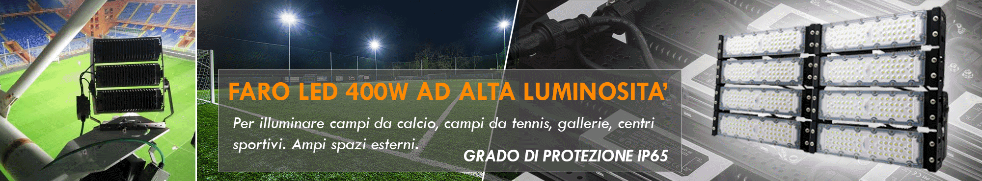 Potentissimo proiettore per esterno con potenza 400W realizzato in alluminio con LED di ultima generazione ad altissima luminosità ideale per l'illuminazione di grandi spazi esterni come campi di calcio, campi di tennis, all'esterno di capannoni, spiazzali, gallerie ed in tutti quei posti dove c'è bisogno di un'elevata fonte di luce. La struttura è realizzata in allumino ed è dtoato di staffa per il fissaggio, inolre è possibile è possibile inclinare il faro tramite la staffa per direzionare meglio la luce.