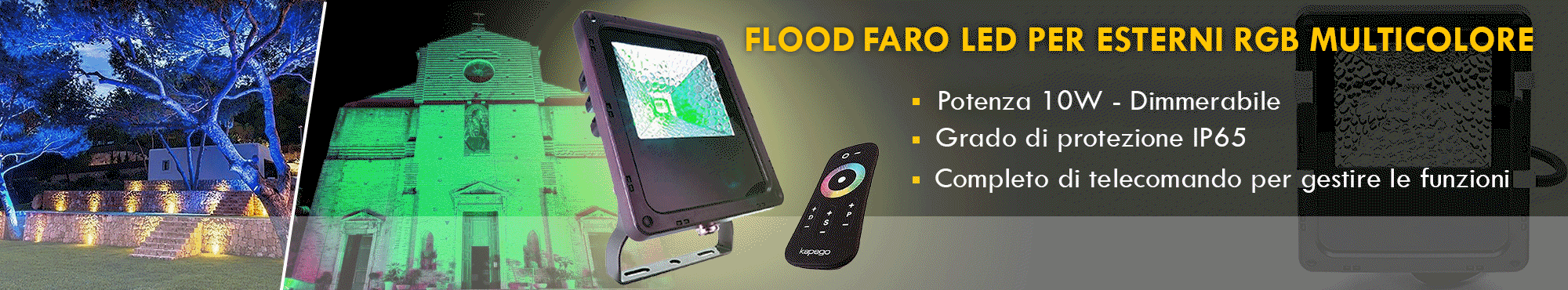 FLOOD Faro proiettore luce LED 10W RGB RF per esterni con grado di protezione IP65. Prodotto professionale completo di telecomando RF per gestire tutte le funzioni. Questo faro RGB è un apparecchio di illuminazione di nuova concezione, frutto di un’accurata scelta di componenti altamente tecnologici e materiali di qualità. Il faro ha un'intensità luminosa di 270 lumen.