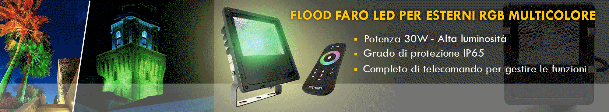 Faro proiettore luce LED 30W RGB RF per esterni con grado di protezione IP65. Prodotto professionale completo di telecomando RF per gestire tutte le funzioni. Questo faro RGB è un apparecchio di illuminazione di nuova concezione, frutto di un’accurata scelta di componenti altamente tecnologici e materiali di qualità. Il faro ha un'intensità luminosa di 1060 lumen.