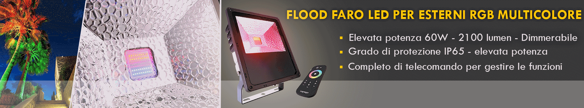 Faro proiettore luce LED 60W RGB RF per esterni con grado di protezione IP65. Prodotto professionale completo di telecomando RF per gestire tutte le funzioni. Questo faro RGB è un apparecchio di illuminazione di nuova concezione, frutto di un’accurata scelta di componenti altamente tecnologici e materiali di qualità.