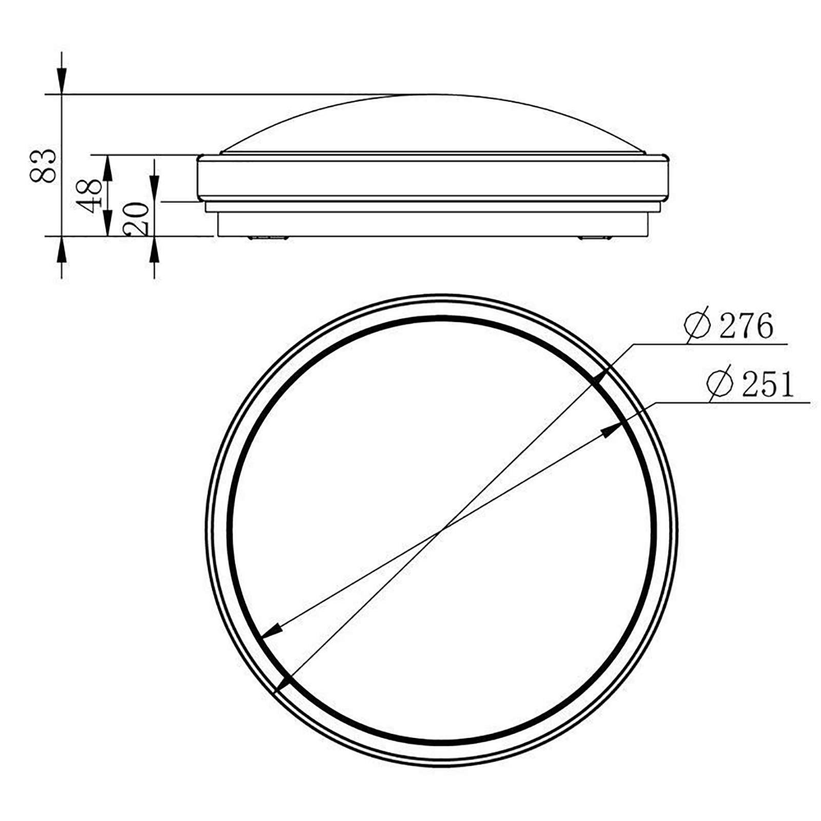 La plafoniera ha una diametro di Ø 276mm x 83mm di spessore - Dimensione base per il fissaggio: Ø 251mm x 20mm