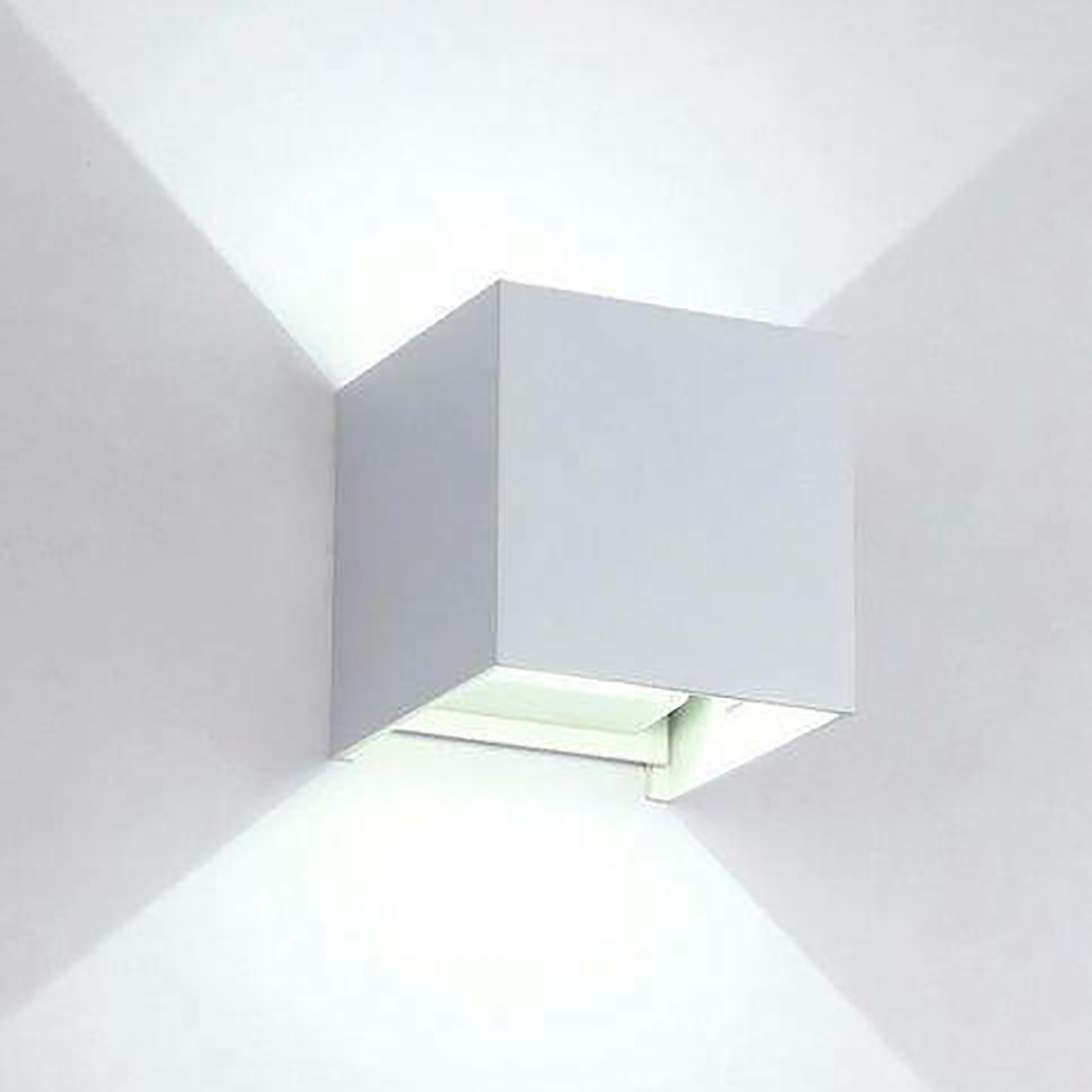 Applique per esterno lampada da parete forma di cubo dal design moderno realizzata in alluminio pressofuso con grado di protezione IP65 completamente impermeabile adatto per resistere agli agenti atmosferici e alle intemperie.