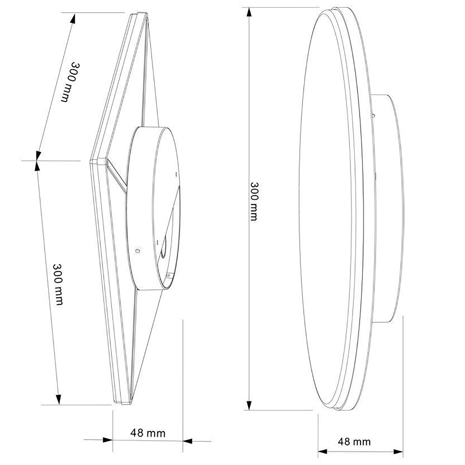 Dimensioni plafoniera quadrata: 300mm x 300mm x 48mm - Dimensioni plafoniera tonda: Ø 300mm x 48mm - Base di fissaggio: Ø 28mm x 170mm