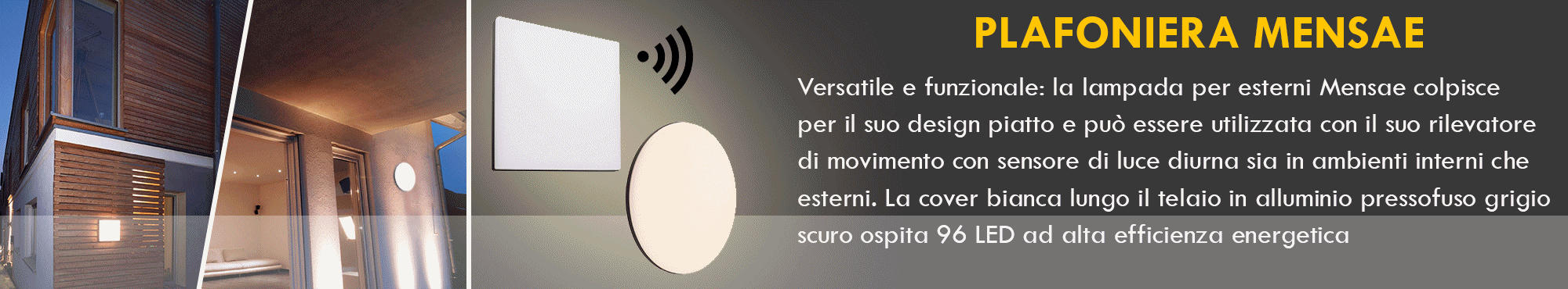 MENSAE Lampada da parete con sensore di movimento ideale per l'illuminazione esterna di garage, giardini, all'esterno di balconi, terrazzi, porticati, sotteranei, ripostigli, passaggi residenziali, ed in tutti quei posti dove c'è bisogno di un'illuminazione automatica senza l'ausilio di interruttori. Infatti grazie al sensore di movimento integrato questa lampada si accende semplicemente al passaggio con un risparmio energetico notevole.