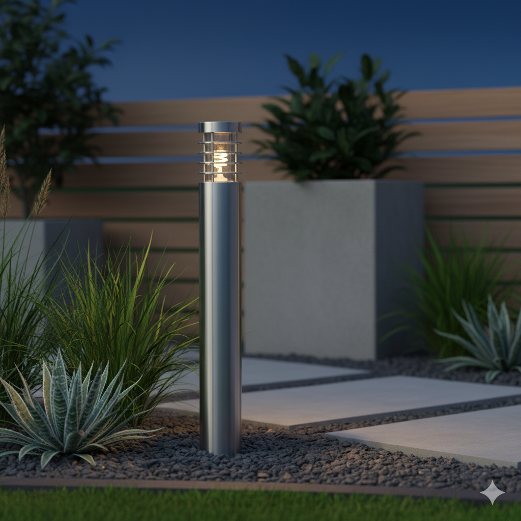 Lampione in acciaio INOX verniciato a polveri epossidiche con attacco E27 ideale per l'illuminazione di spazi esterni come giardini, percorsi pedonali, vialetti, parchi, all'esterno di centri commerciali. Si alimenta a 230V ed ha un grado di protezione IP44 resistente alle intemperie e gli agenti atomosferici.