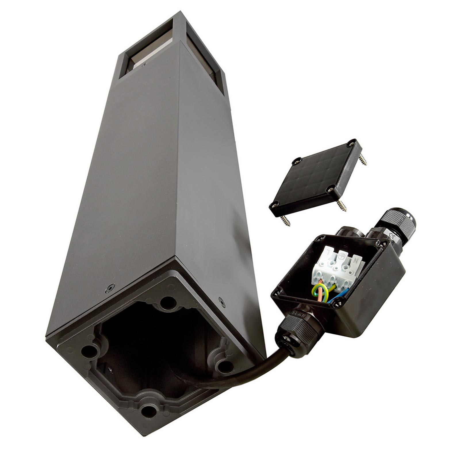 La scatola di connessione ha un grado di protezione IP67 ed è dotata di un doppio pressacavo M20 adatto per cavi interrati di dimensioni 3x1,5 mm², 5x1,5 mm² o 3x2,5 mm² e oltre.