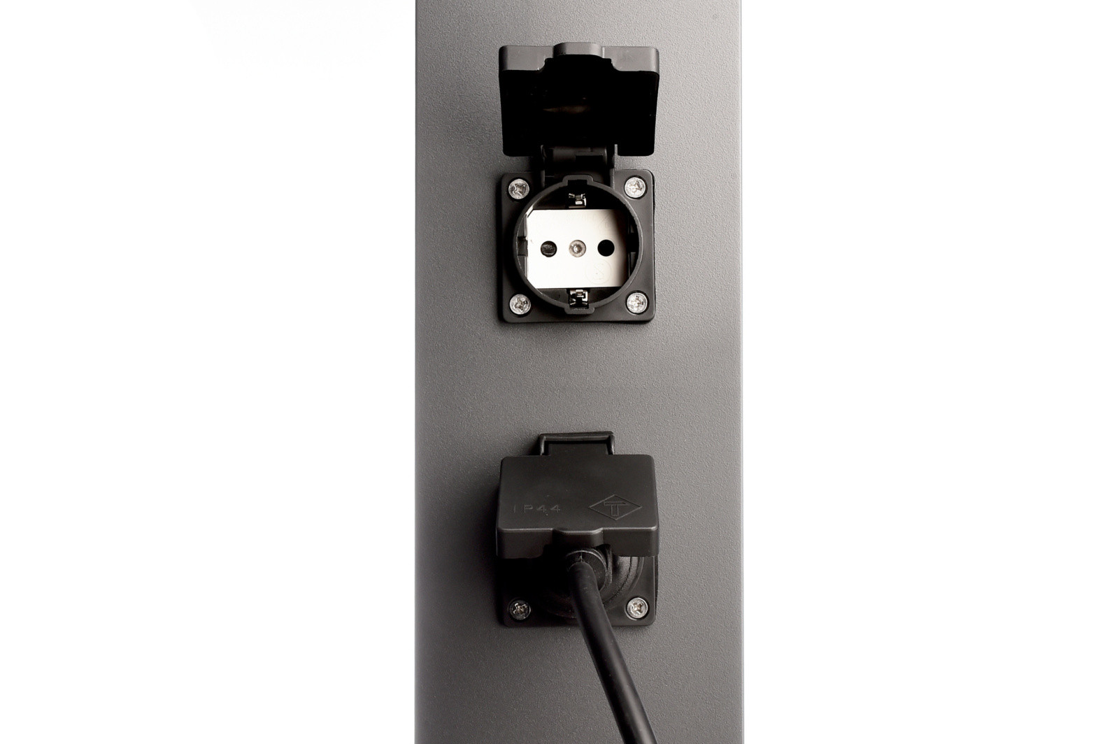 Si alimenta a 230V ed ha un grado di protezione IP54 resistente alle intemperie e gli agenti atmosferici. Viene fornito completo di basamento per installazione su plinto o pavimentazione.