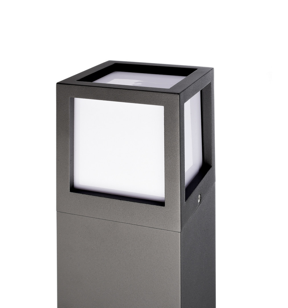 FACADO Lampione moderno colonnina con 2 prese elettriche di forma quadrata adatto per uso esterno realizzato in alluminio pressofuso di colore grigio scuro dotato di diffusore in policarbonato opaco con portalampada attacco E27 ideale non solo per l'illuminazione esterna di giardini, spazi verdi, parchi, all'esterno di abitazioni, all'esterno di ville, cortili, utile anche per ricaricare dispositivi elettrici.