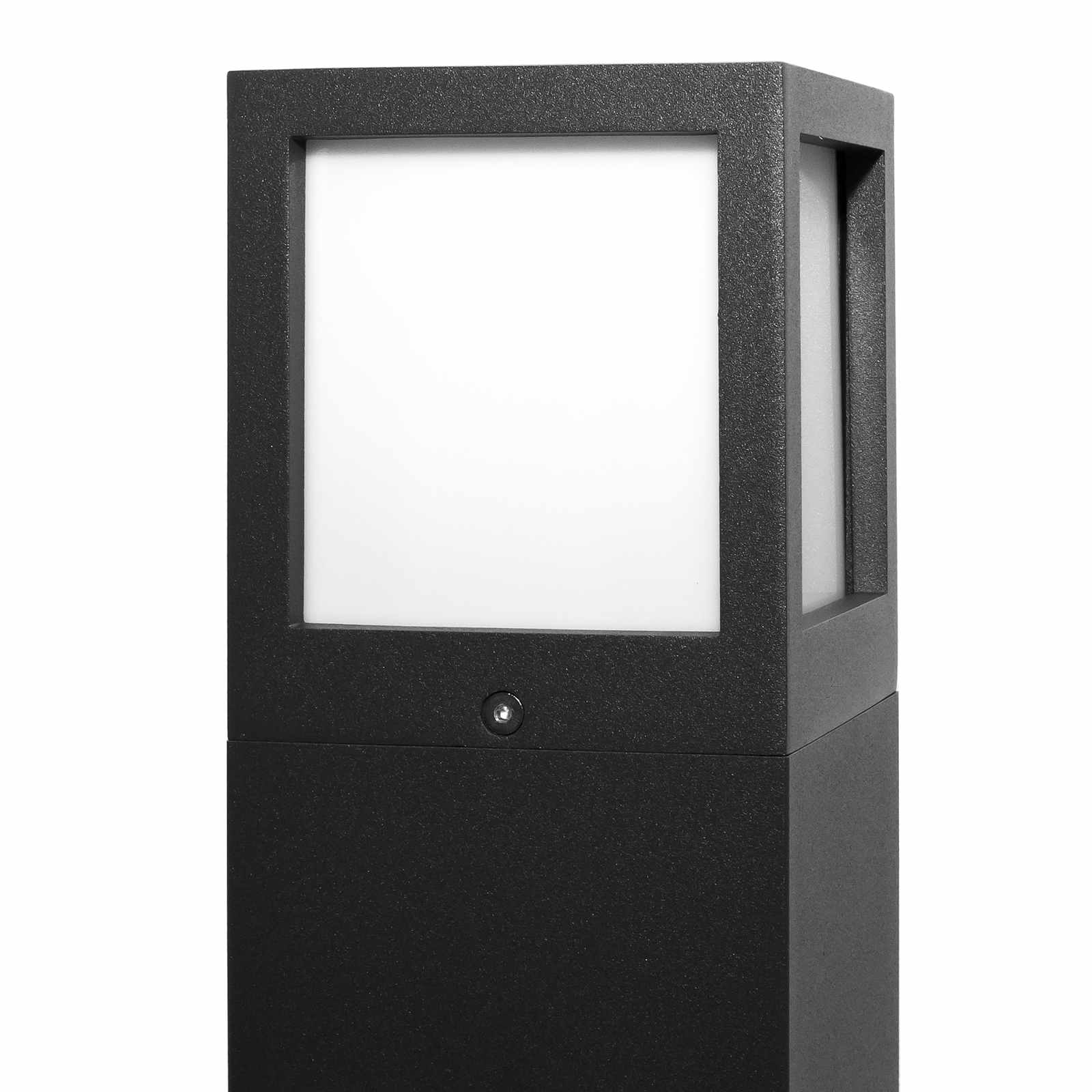 FACADO Lampione moderno colonnina con 2 prese elettriche di forma quadrata adatto per uso esterno realizzato in alluminio pressofuso di colore grigio scuro dotato di diffusore in policarbonato opaco con portalampada attacco E27 ideale non solo per l'illuminazione esterna di giardini, spazi verdi, parchi, all'esterno di abitazioni, all'esterno di ville, cortili, utile anche per ricaricare dispositivi elettrici.