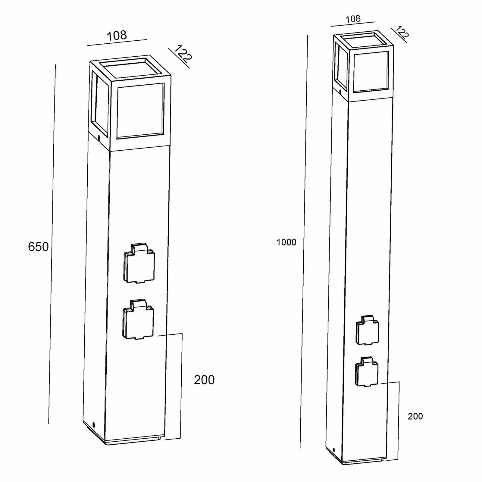Disponibile in 2 misure da 65cm e 100cm - Dimensioni lampione 65cm: 108mm x 108mm x 650mm - Dimensioni lampione 100cm: 110mm x 110mm x 1000mm.
