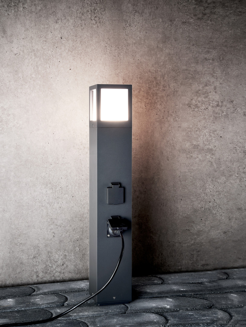 FACADO Lampione moderno colonnina con 2 prese elettriche di forma quadrata adatto per uso esterno realizzato in alluminio pressofuso di colore grigio scuro dotato di diffusore in policarbonato opaco con portalampada attacco E27 ideale non solo per l'illuminazione esterna di giardini, spazi verdi, parchi, all'esterno di abitazioni, all'esterno di ville, cortili, utile anche per ricaricare dispositivi elettrici.