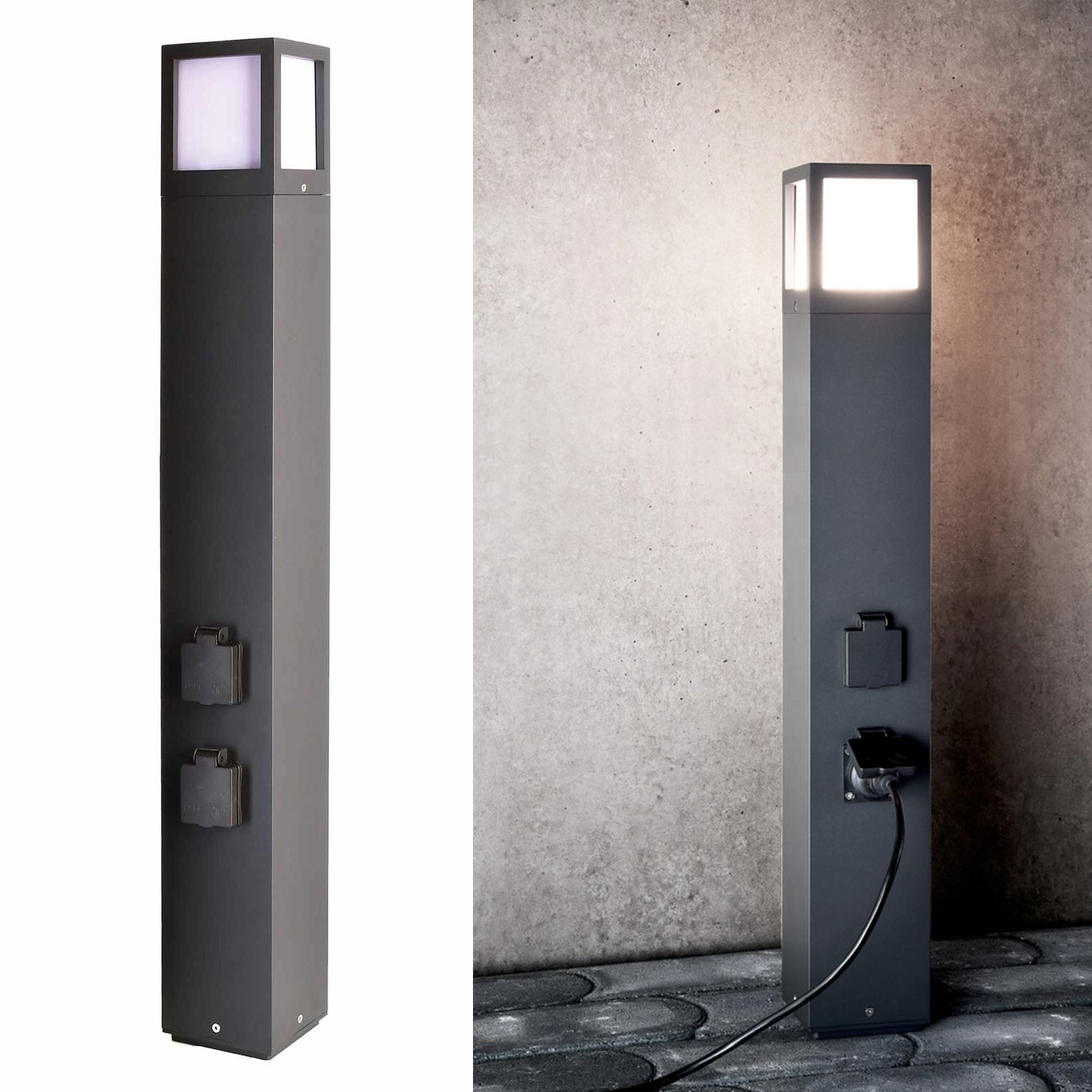 FACADO Lampione moderno colonnina con 2 prese elettriche di forma quadrata adatto per uso esterno realizzato in alluminio pressofuso di colore grigio scuro dotato di diffusore in policarbonato opaco con portalampada attacco E27 ideale non solo per l'illuminazione esterna di giardini, spazi verdi, parchi, all'esterno di abitazioni, all'esterno di ville, cortili, utile anche per ricaricare dispositivi elettrici.