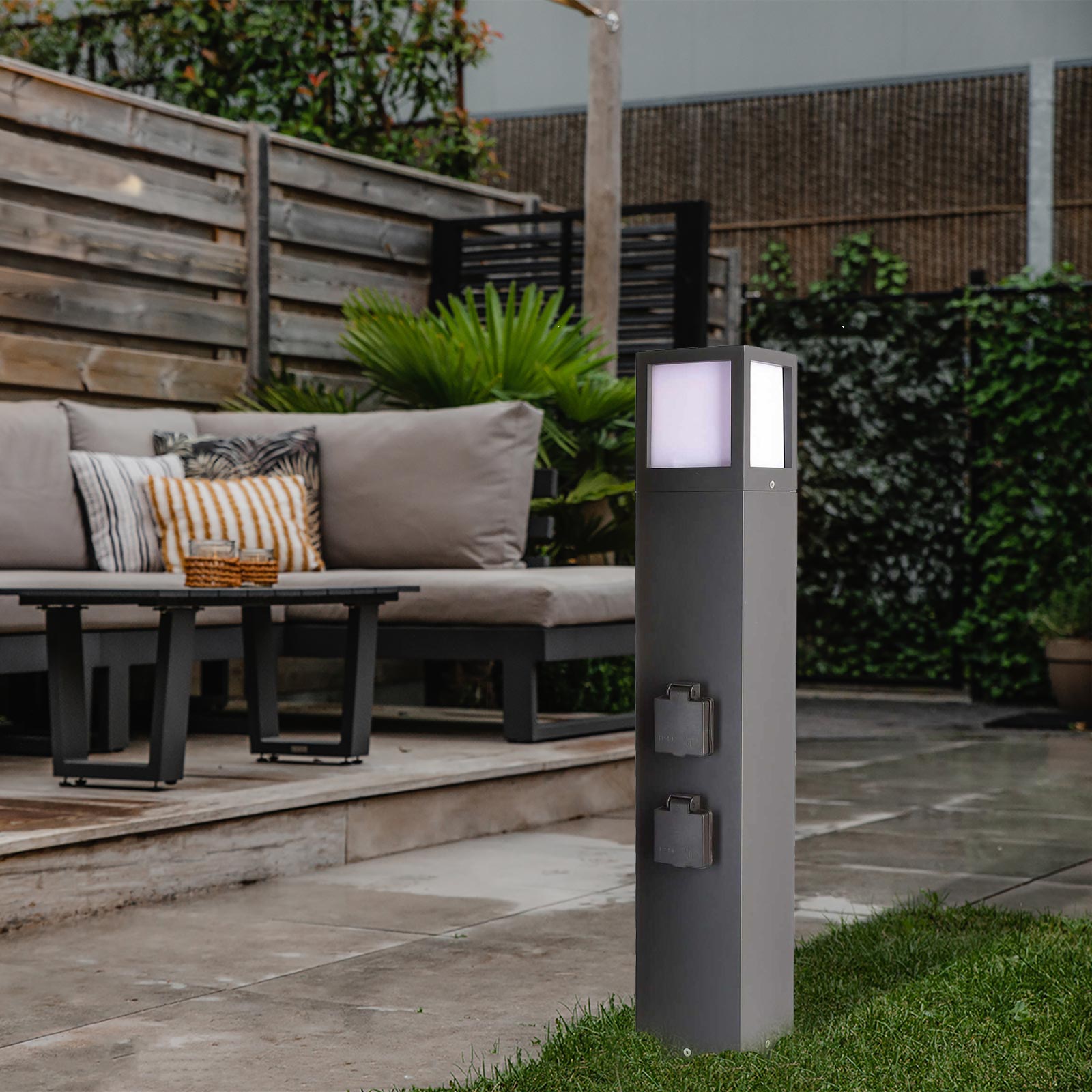 FACADO Lampione moderno colonnina con 2 prese elettriche di forma quadrata adatto per uso esterno realizzato in alluminio pressofuso di colore grigio scuro dotato di diffusore in policarbonato opaco con portalampada attacco E27 ideale non solo per l'illuminazione esterna di giardini, spazi verdi, parchi, all'esterno di abitazioni, all'esterno di ville, cortili, utile anche per ricaricare dispositivi elettrici.