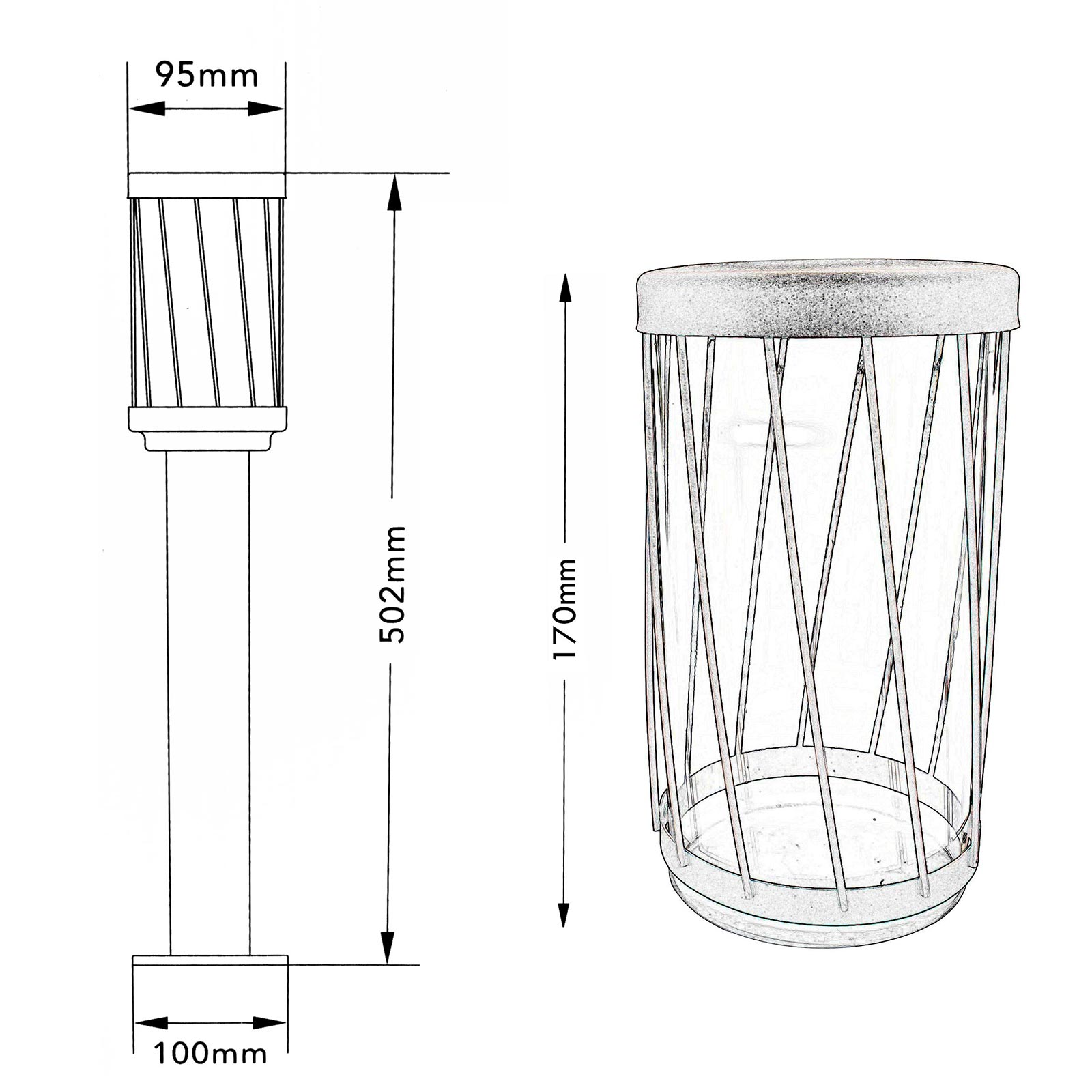 Questo lampione ha un'altezza totale di 502mm. Il diametro del diffusore è di Ø 95mm con un altezza totale di 170mm. La base ha un diametro di Ø 100mm x 5mm di altezza.