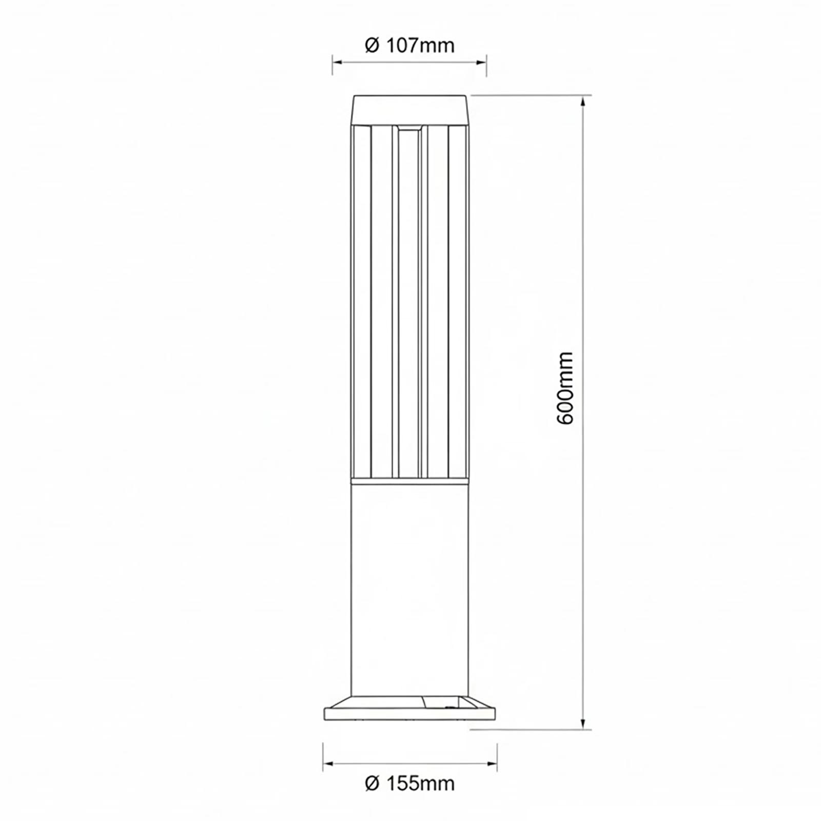 Dimensioni lampione: 600 mm x Ø 107mm - Dimensione base di fissaggio: Ø 155mm