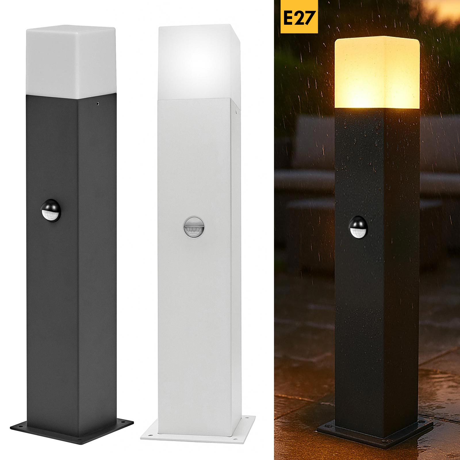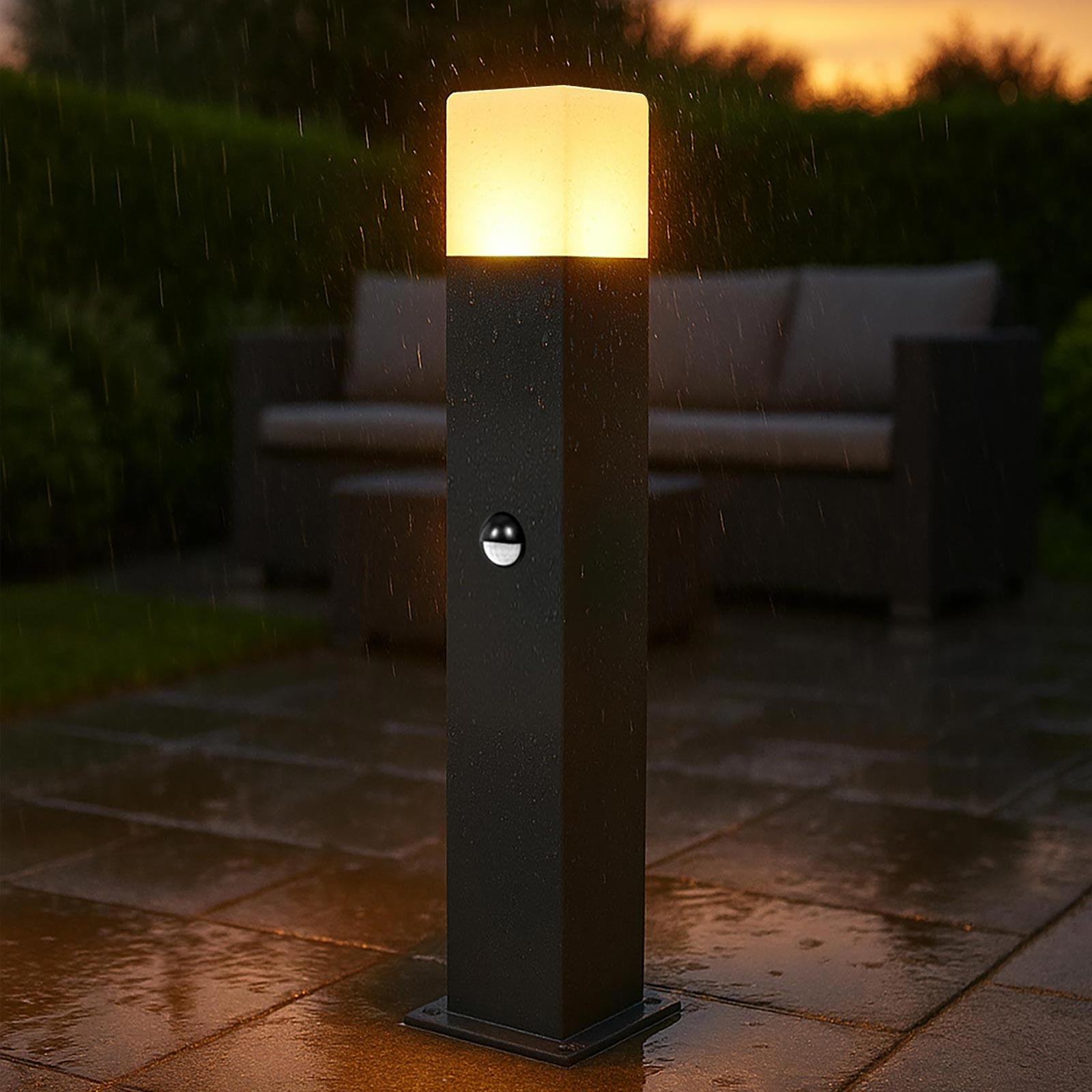 Lampione LED da giardino con attacco E27 con sensore di movimento crepuscolare, la soluzione pratica e funzionale per l’illuminazione esterna di viali, cortili, ingressi e percorsi pedonali. Il prodotto è compatibile con lampadine E27 (non inclusa) con potenza fino a un massimo di 12W.