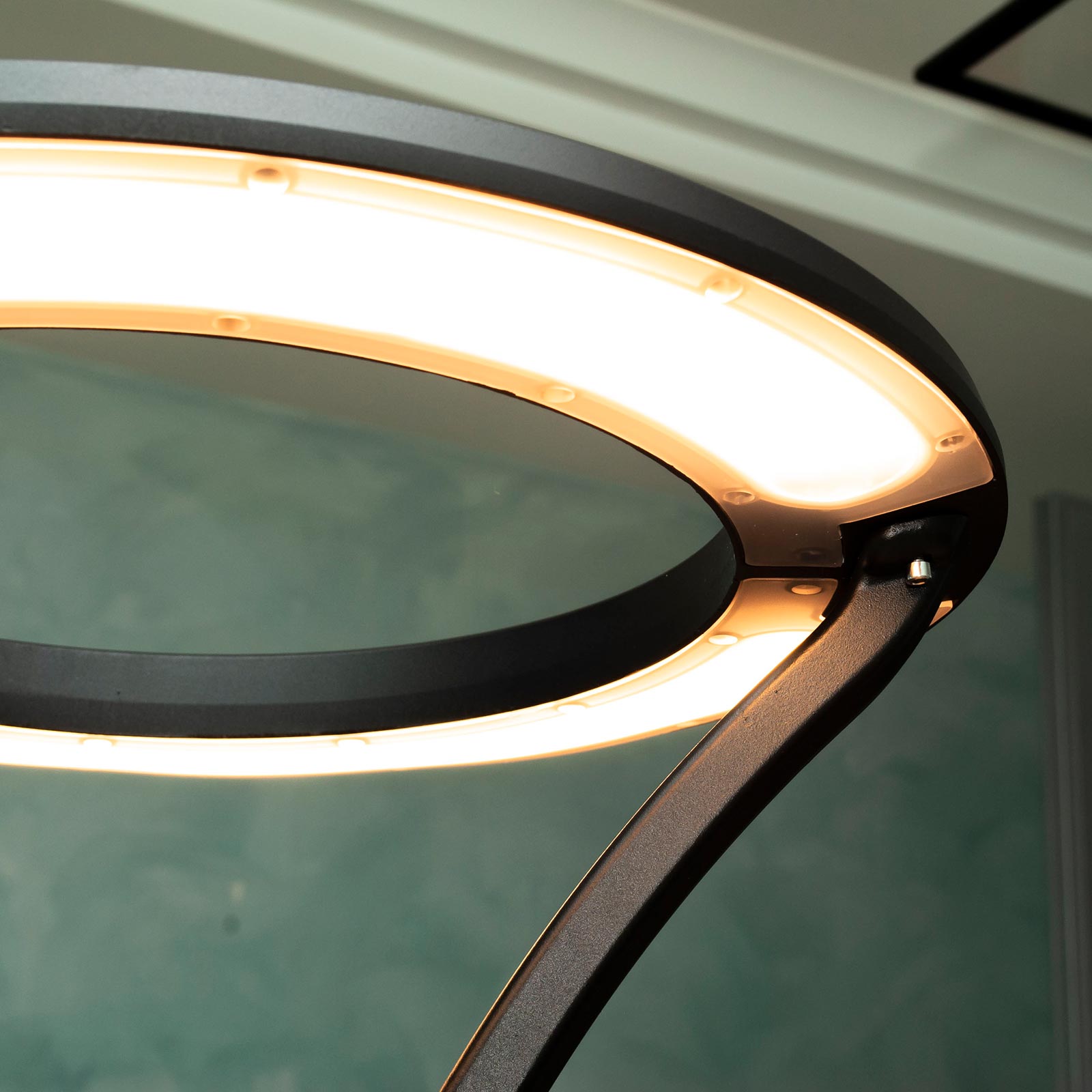 Questo lampione ha una forma circolare ed è dotato di LED integrati di ultima generazione che sprigionano una potenza di 100W con un consumo energetico ridotto. Il LED si trova sotto al cerchio e sono coperti da una protezione in plastica opaca che oltre a proteggere i LED dalle intemperie ne assicura una luce potente che non abbaglia la vista.