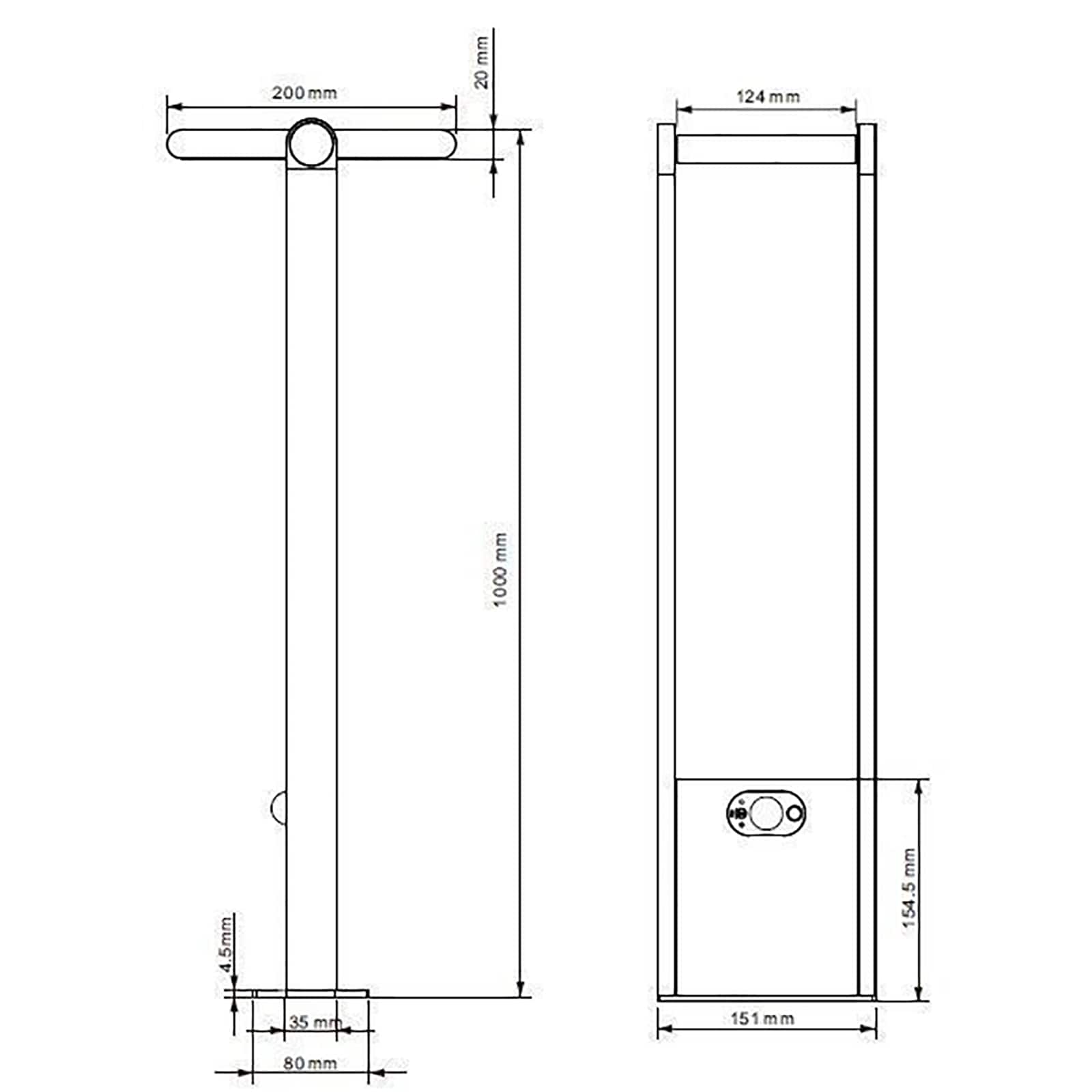 Dimensioni lampione solare da esterno: 1000mm x 151mm x 80mm - Dimensioni base di fissaggio: 80mm 151mm x 4.5mm