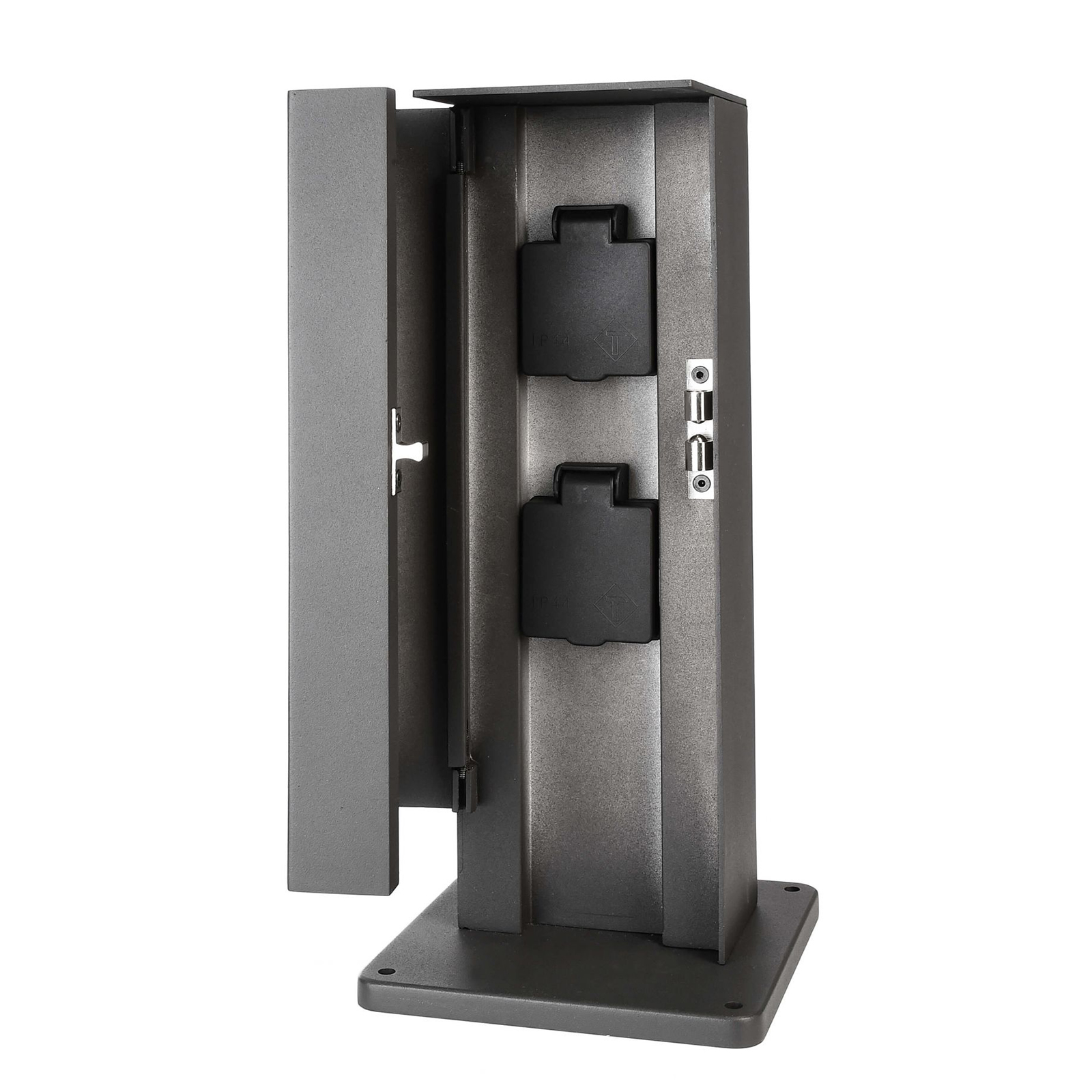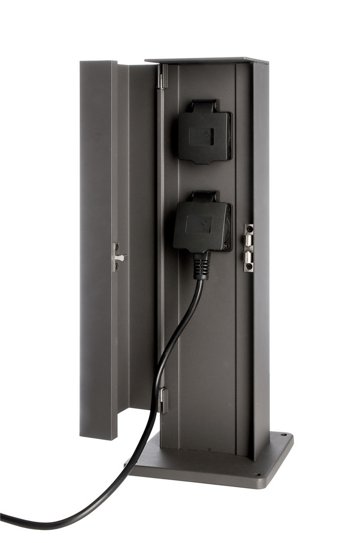 La colonnina è dotata i sportello protettivo in alluminio pressofuso, le prese hanno una protezione in plastica ed un grado di protezione IP54. La colonna è di colore grigio scuro ed è dotata di base per il fissaggio a terra - Si alimenta direttamente alla rete elettrica 230V. Supporta un carico massimo di 3680W