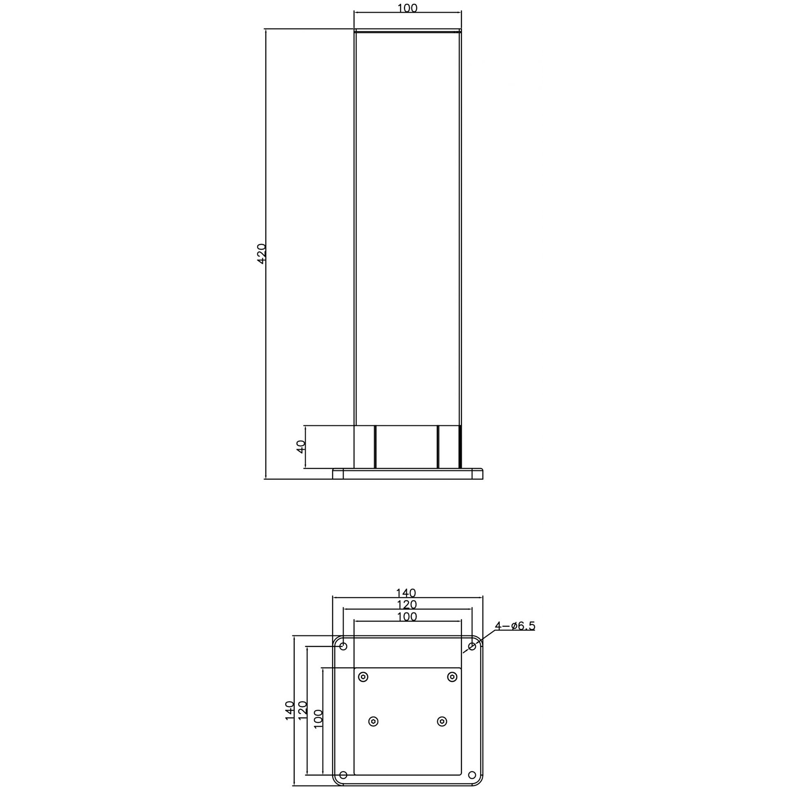 Dimensioni: 420mm di altezza x 140mm di larghezza. Dimensioni base di fissaggio: 140mm x 140mm