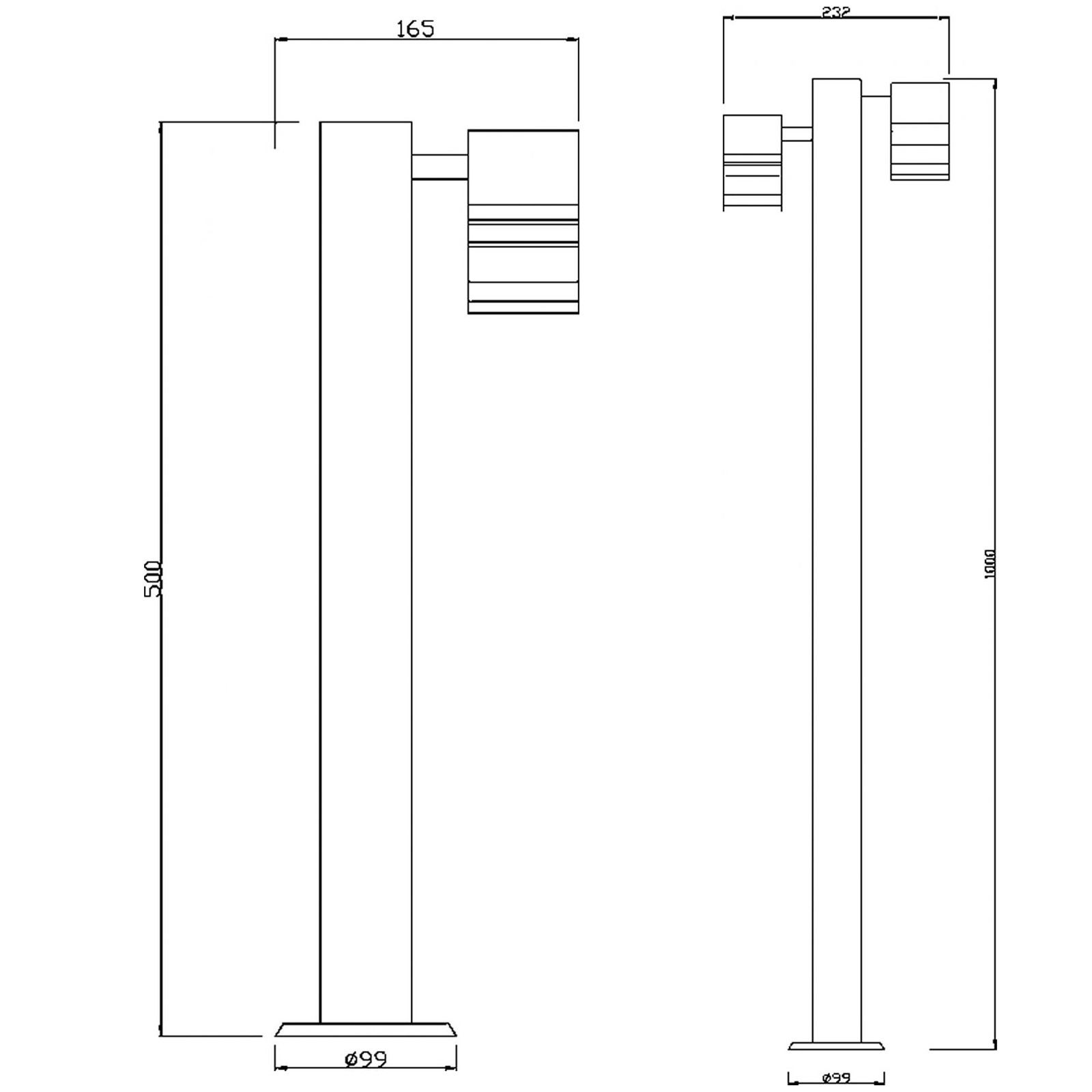 Dimensioni lampione singolo diffusore: 500mm x 165mm x Ø 99mm - Dimensioni lampione doppio diffusore: 1000mm x 165mm x Ø 99mm