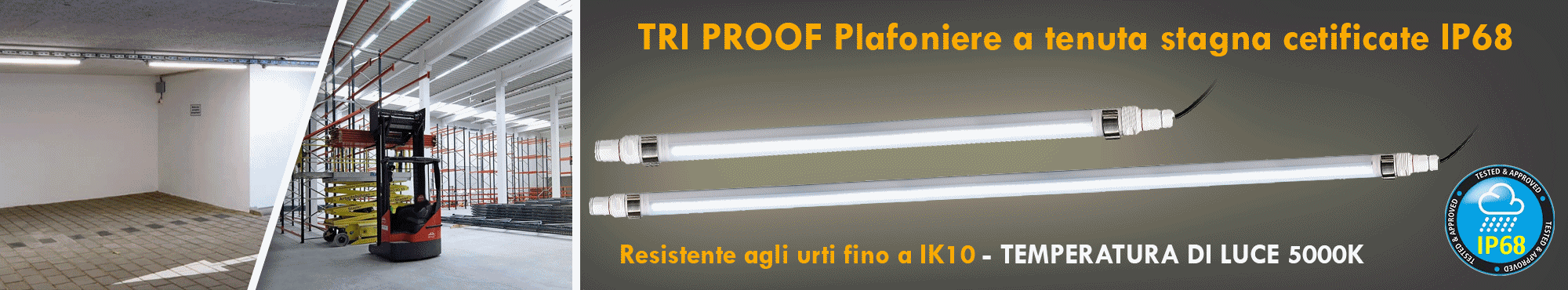 Plafoniera LED completamente a tenuta stagna ideale per uso interno ed esterno ed in tutte quelle situazioni dove c'è bisogno di un prodotto per illuminare resistente all'acqua e gli agenti atmosferici. Questa plafoniera ha un grado di protezione IP68 certificato ed è ideale per installazioni a soffitto per l'illuminazione di garage, parcheggi, officine, fabbriche, per l'illuminazione di gallerie, centri commerciali, magazzini e altri luoghi con presenza di umidità.